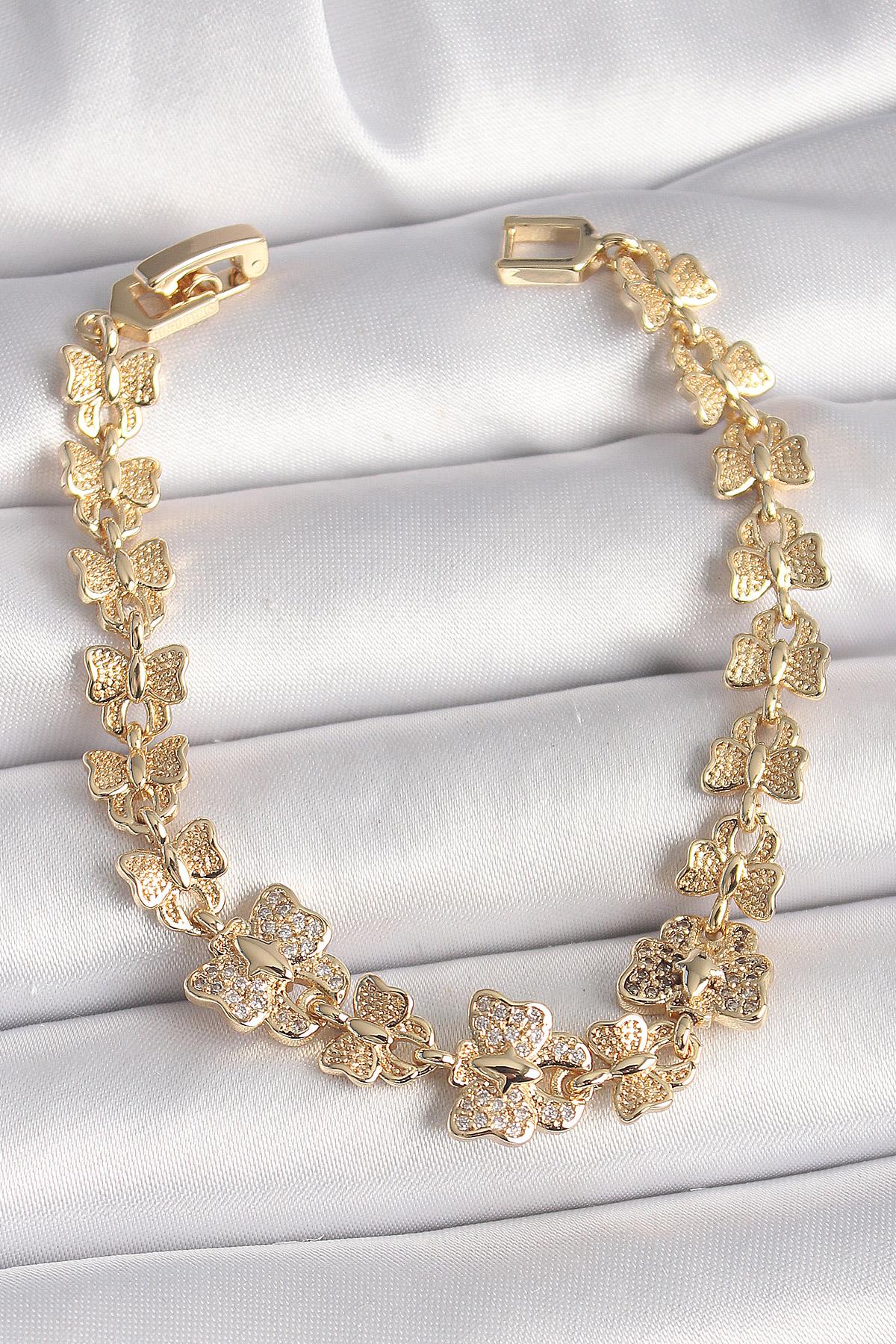 Pirinç Gold Renk Zirkon Taşlı Kelebek Model Zincir Kadın Bileklik