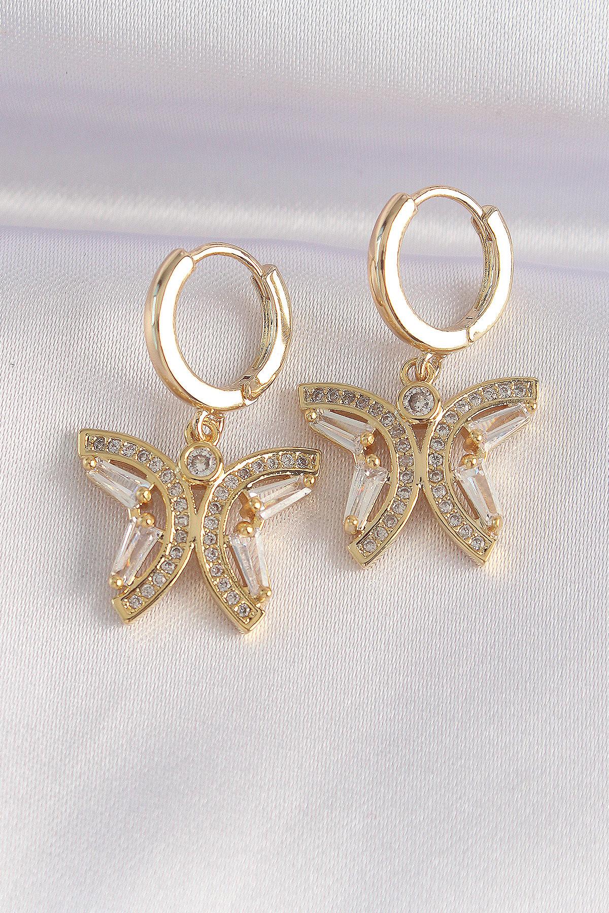 Pirinç Gold Renk Zirkon Taşlı Kelebek Tasarım Küpe