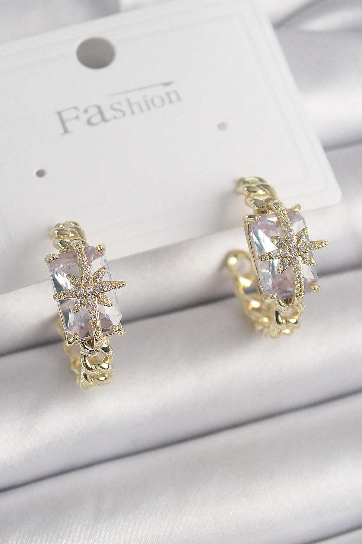 Pirinç Gold Renk Zirkon Taşlı Kutup Yıldızı İşlemeli Kadın Küpe