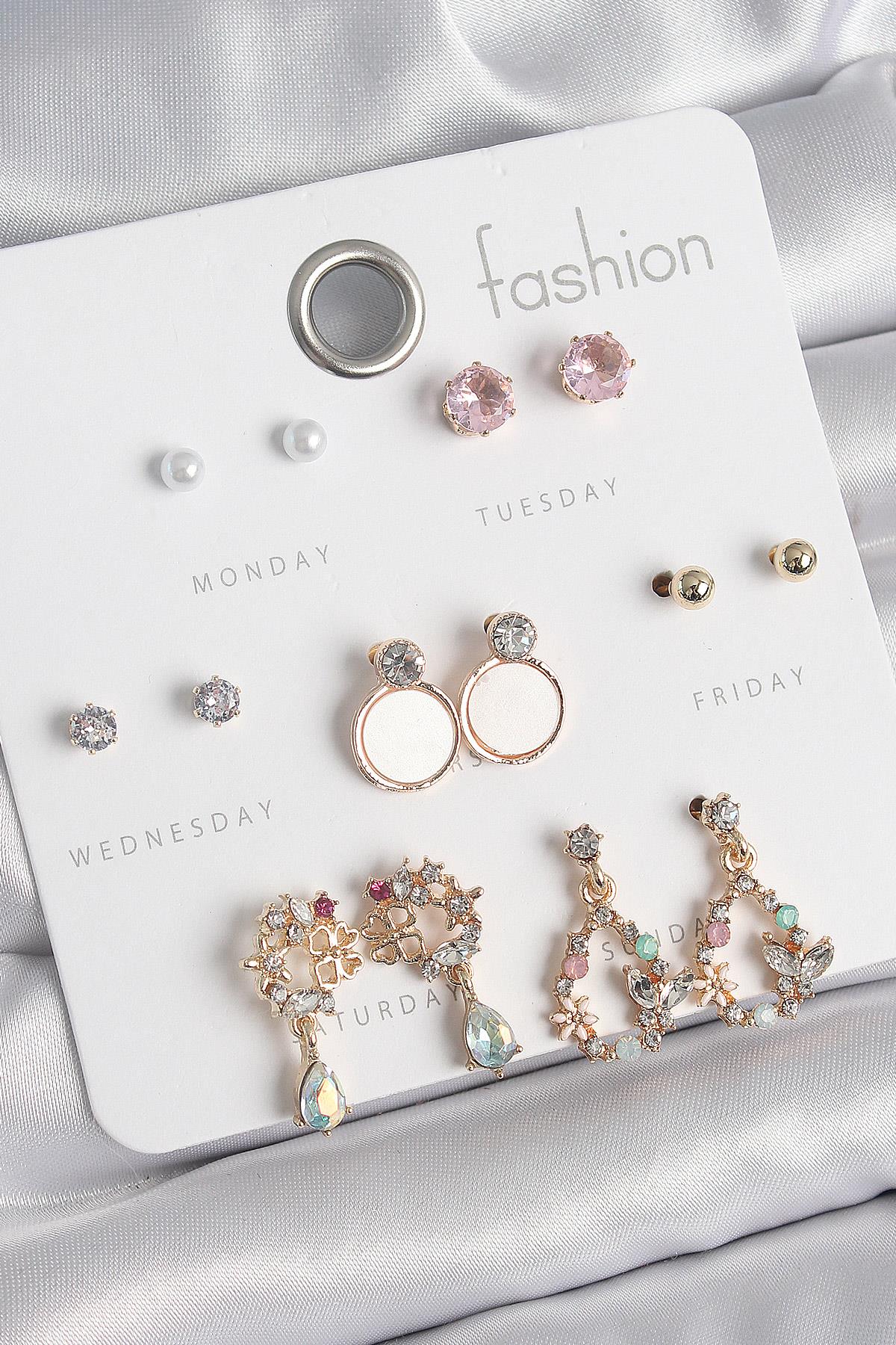 Pirinç Gold Renk Zirkon Taşlı Sallantı Damla Figür Beyaz Mine Detay 7 Çift Kadın Küpe Seti