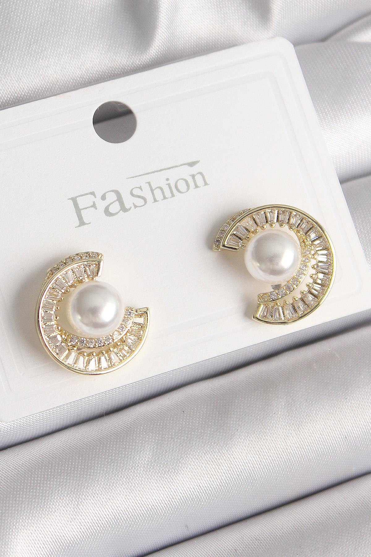 Pirinç Gold Renk Zirkon Taşlı Salyangoz Model İnci Detay Kadın Küpe