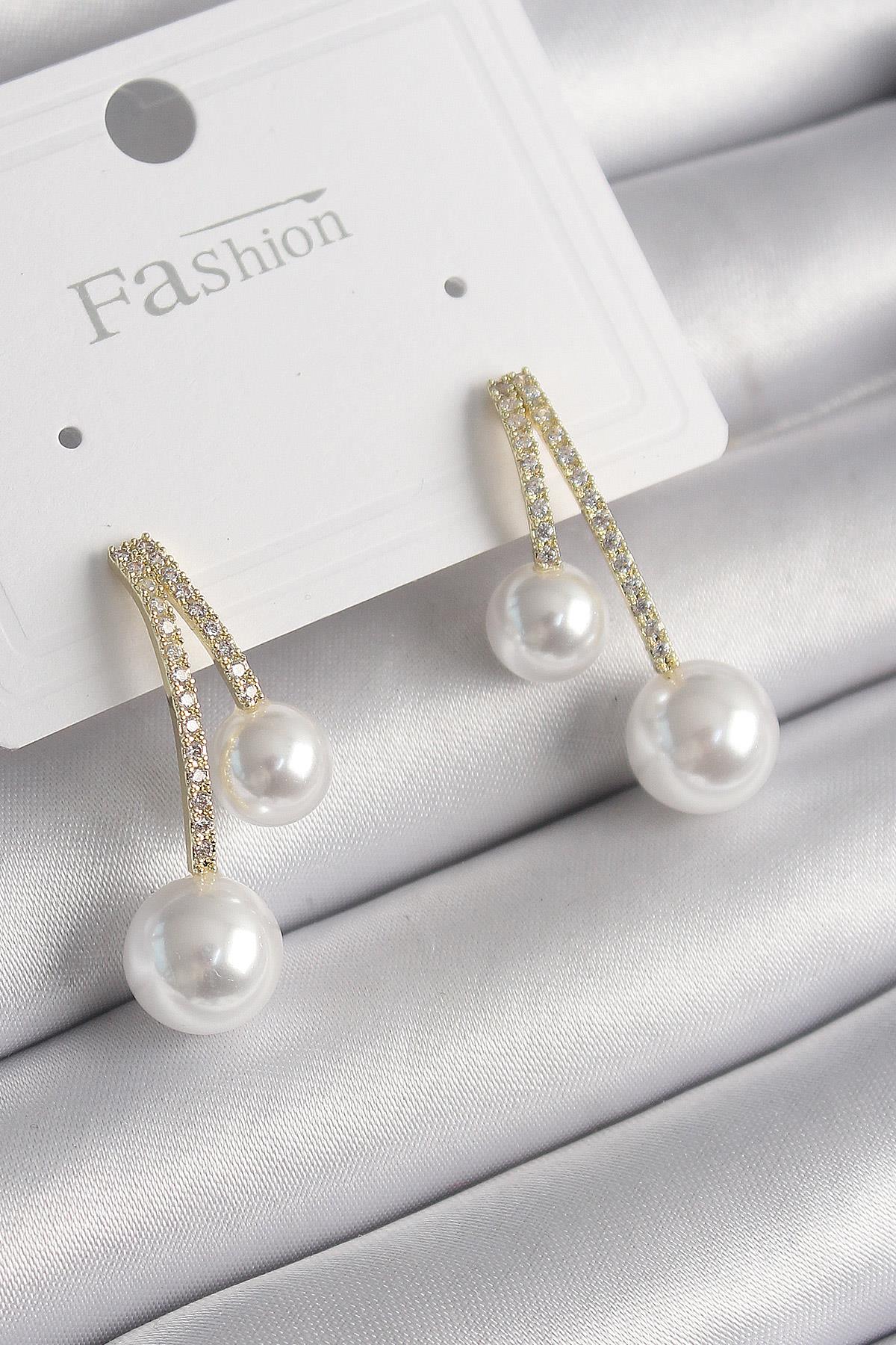 Pirinç Gold Renk Zirkon Taşlı Sarkıt Model İnci Detay Kadın Küpe