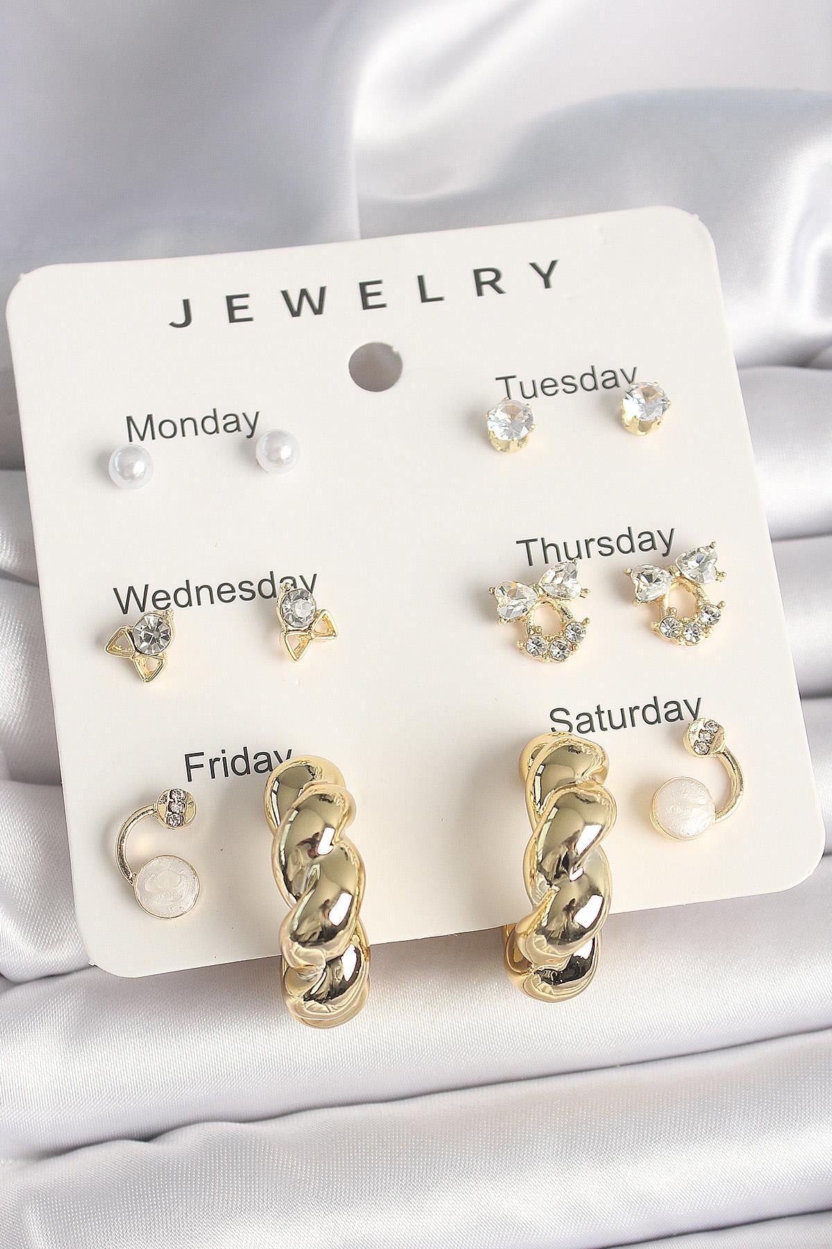 Pirinç Gold Renk Zirkon Taşlı Sarmal Halka Model 7'Li Kadın Küpe Seti