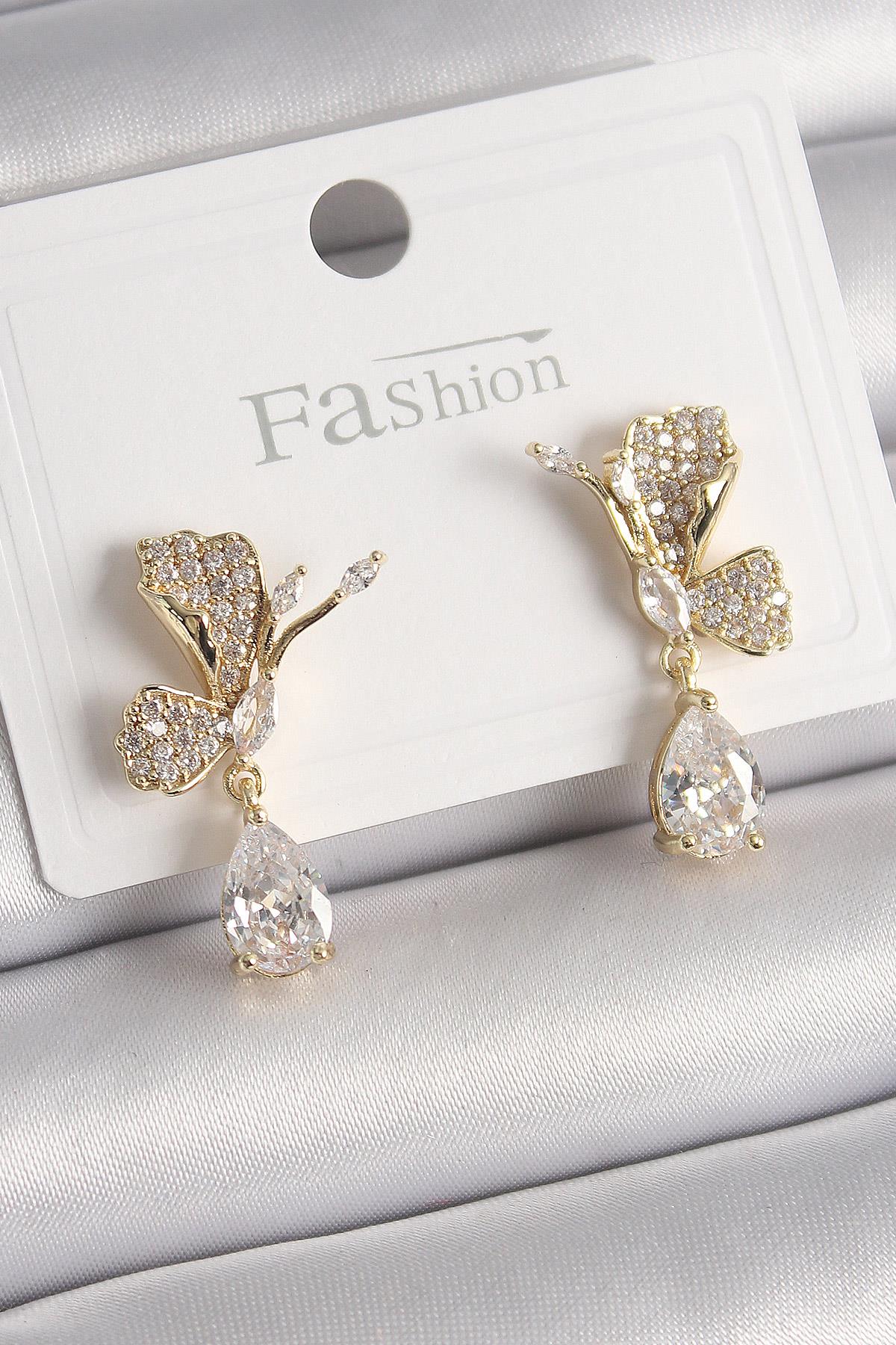 Pirinç Gold Renk Zirkon Taşlı Turna Kuşu Model Sallantı Detay Kadın Küpe