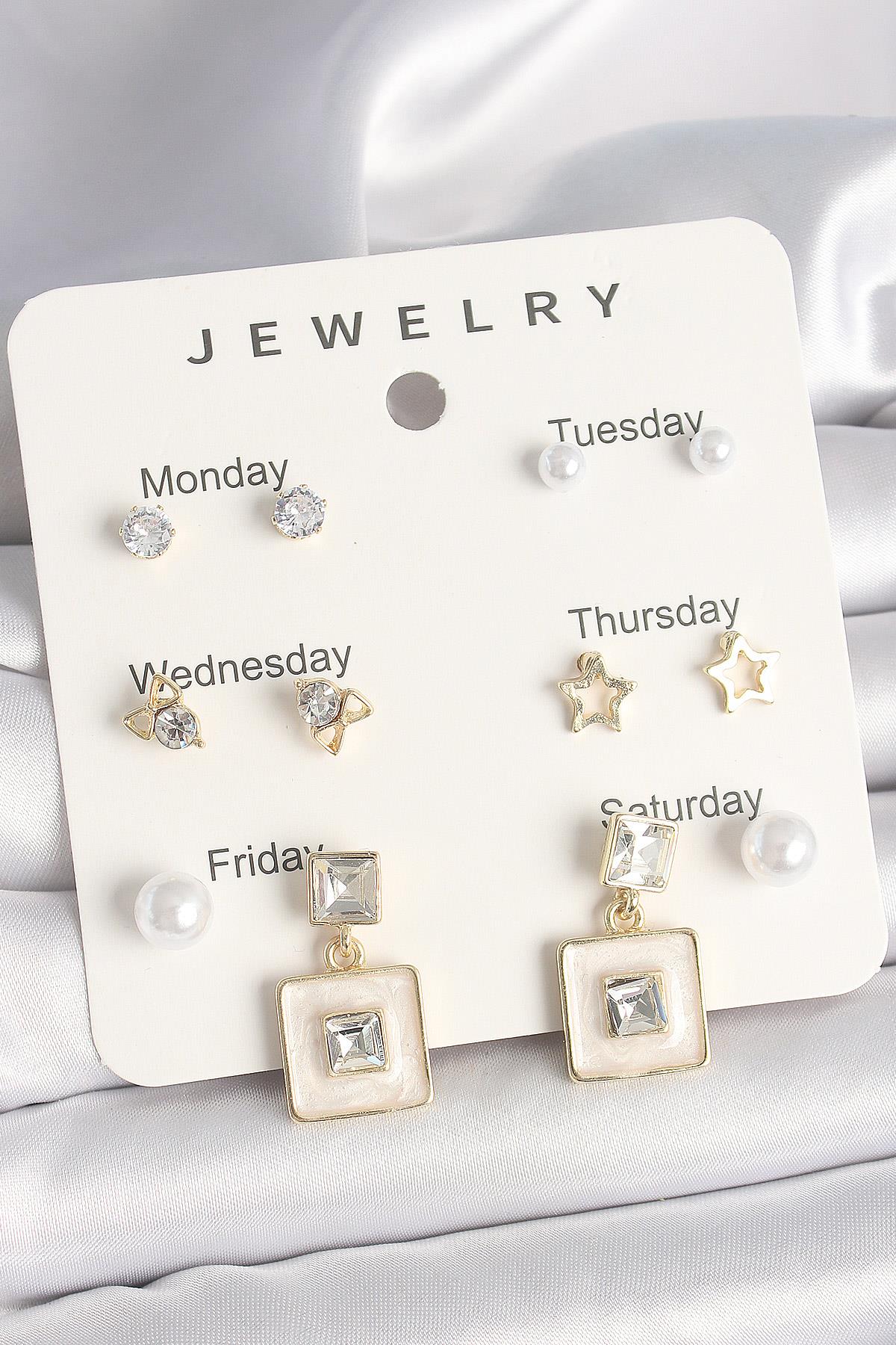 Pirinç Gold Renk Zirkon Taşlı Yıldız Figür Sallantı Beyaz Mineli Model 7'Li Kadın Küpe Seti