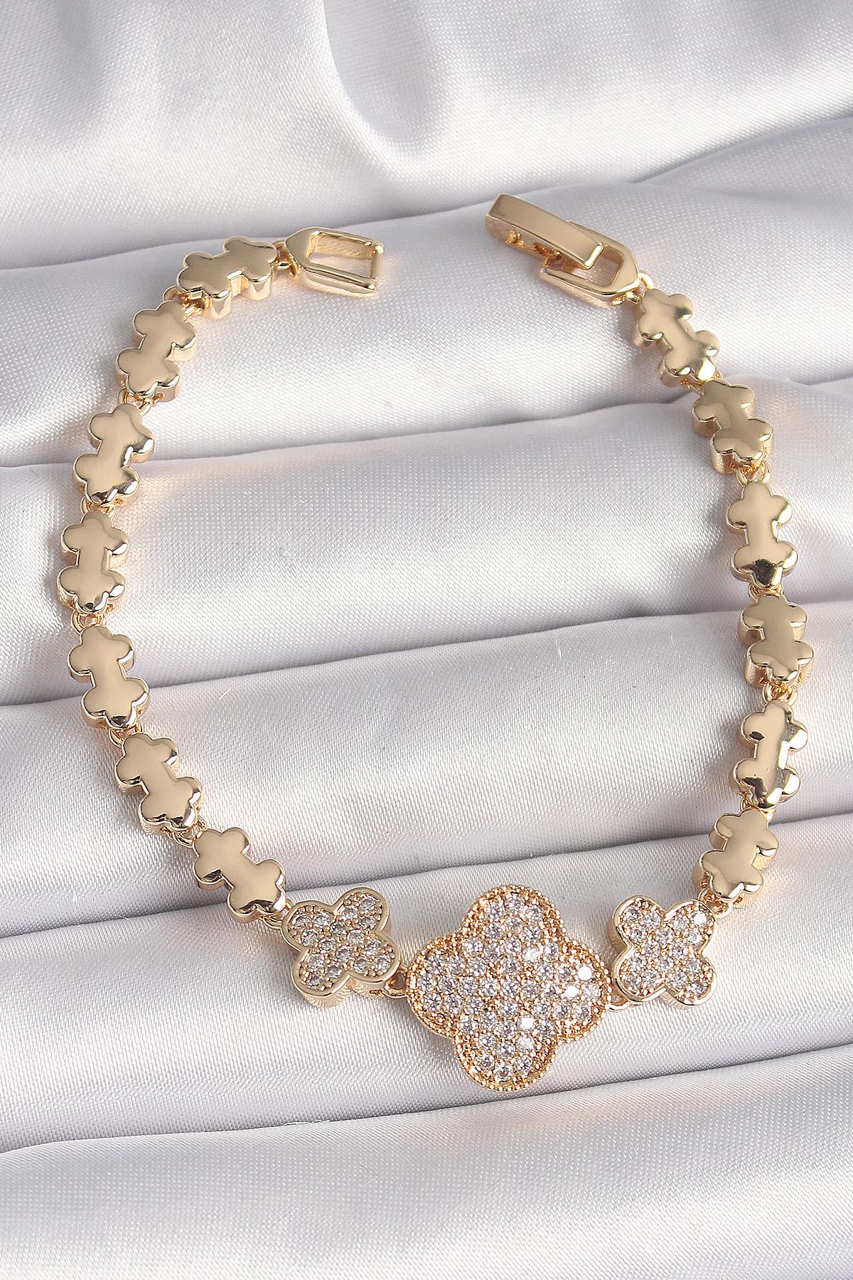 Pirinç Gold Renk Zirkon Taşlı Yonca Model Zincir Kadın Bileklik