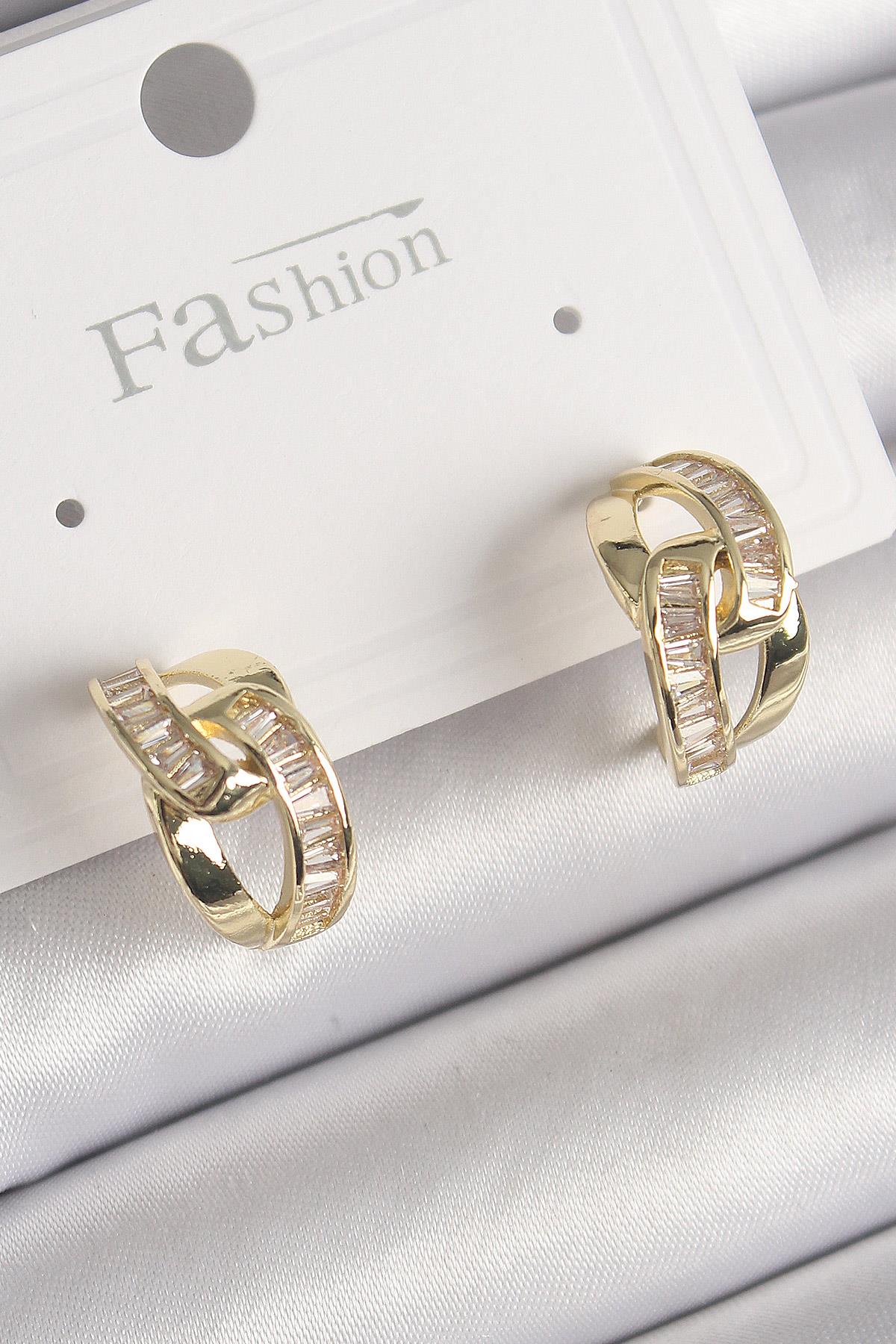Pirinç Gold Renk Zirkon Taşlı Zincir Model Kadın Küpe