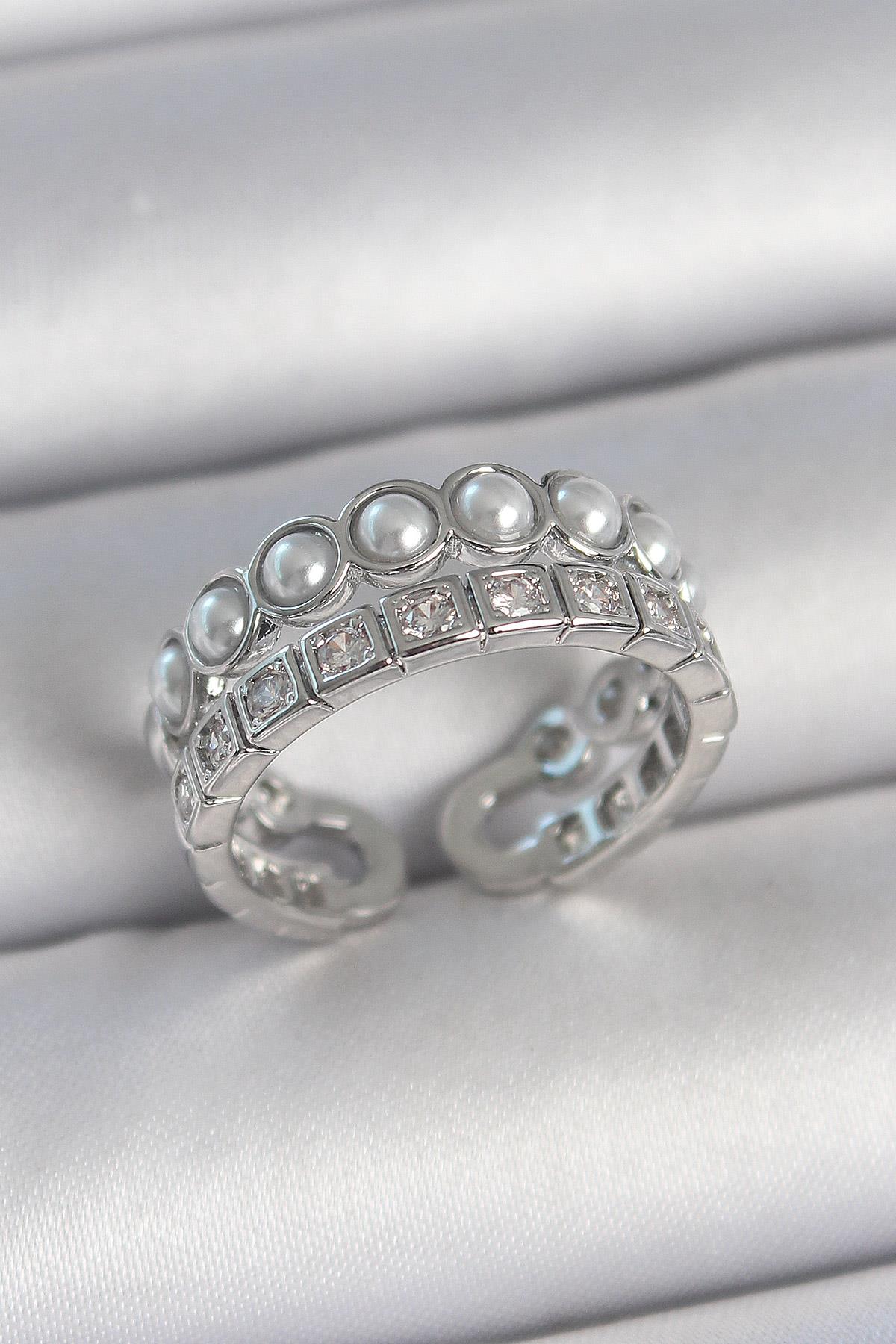 Pirinç Gümüş Renk 2'Li Sıra Zirkon Taşlı Ve İncili Ayarlanabilir Kadın Yüzük
