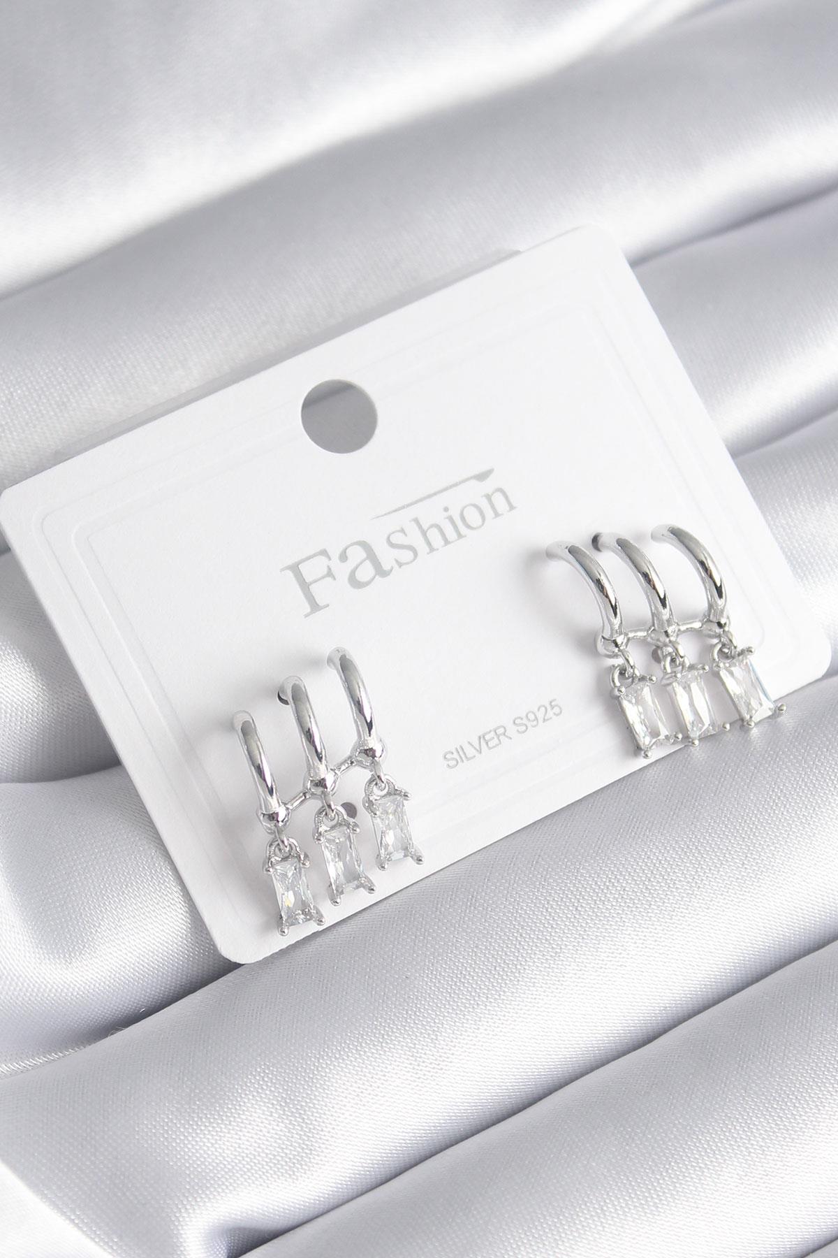 Pirinç Gümüş Renk 3'lü Sallantı Zirkon Taşlı Küpe
