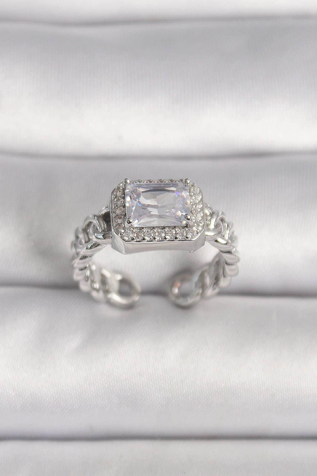 Pirinç Gümüş Renk Ayarlanabilir Zincir Kare Zirkon Taşlı Kadın Yüzük