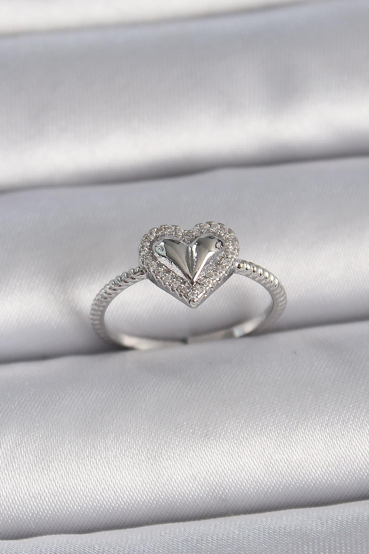 Pirinç Gümüş Renk Ayarlanabilir Zirkon Taşlı Kalp Model Kadın Yüzük