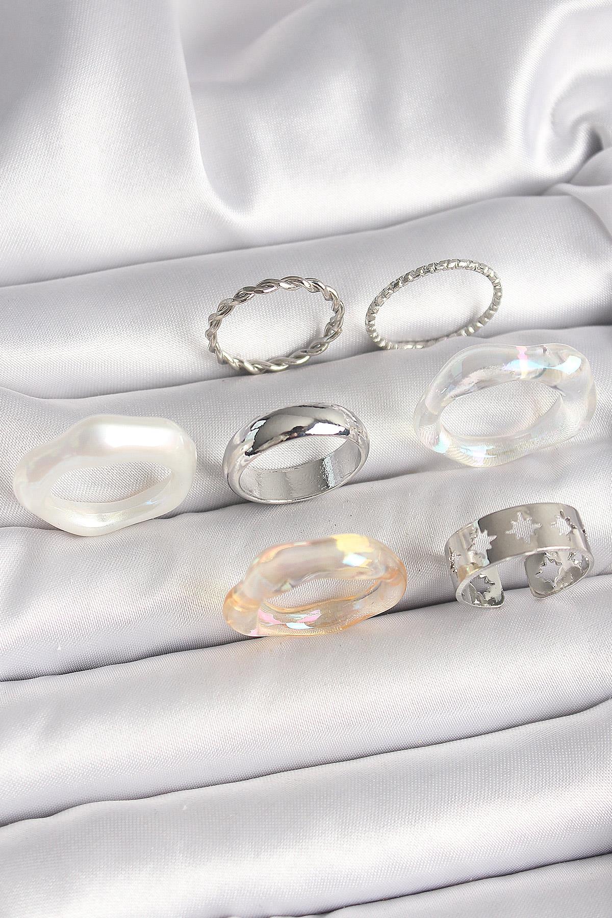 Pirinç Gümüş Renk Beyaz Akrilik Plastik Model Kutup Yıldız İşleme Detaylı Kadın Yüzük Kombini