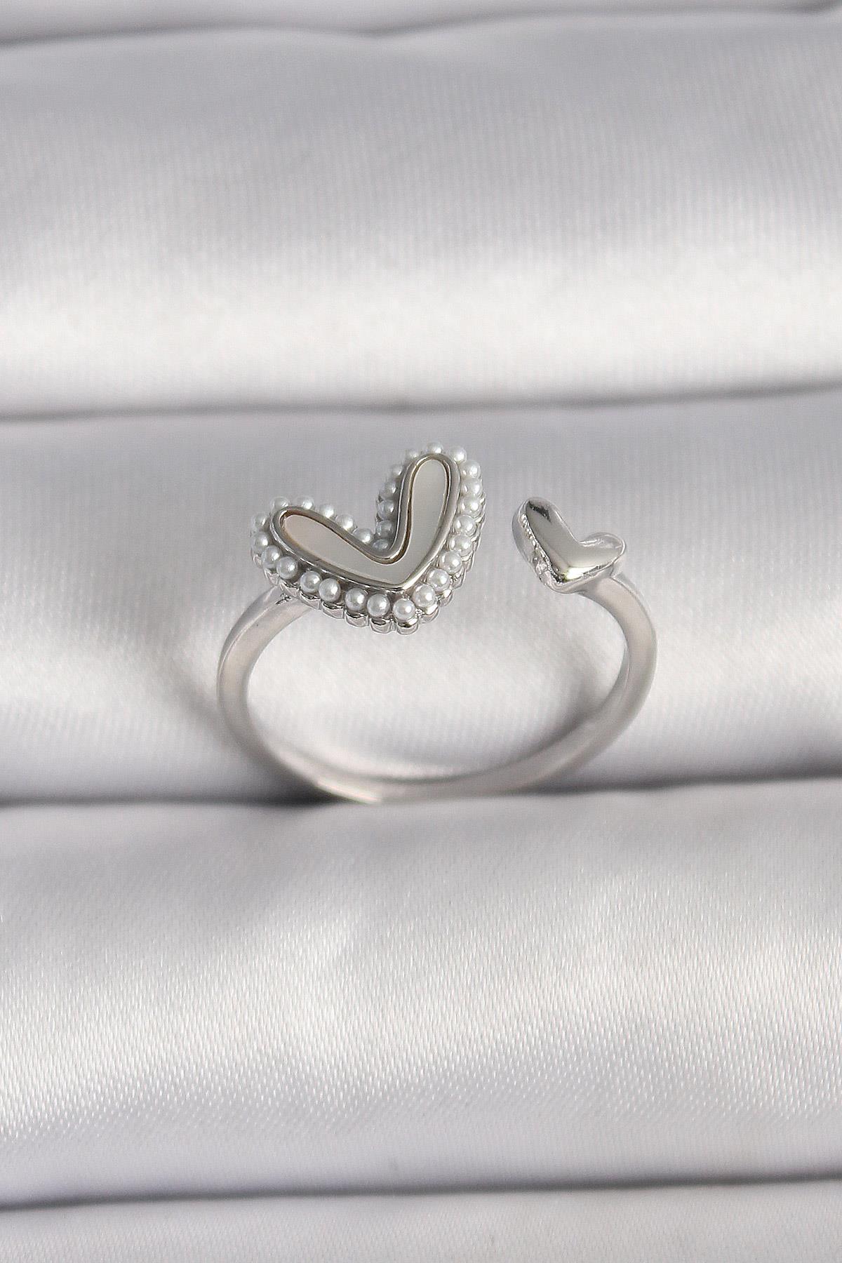 Pirinç Gümüş Renk Beyaz Mineli İnci Detaylı Kalp Model Ayarlanabilir Yüzük
