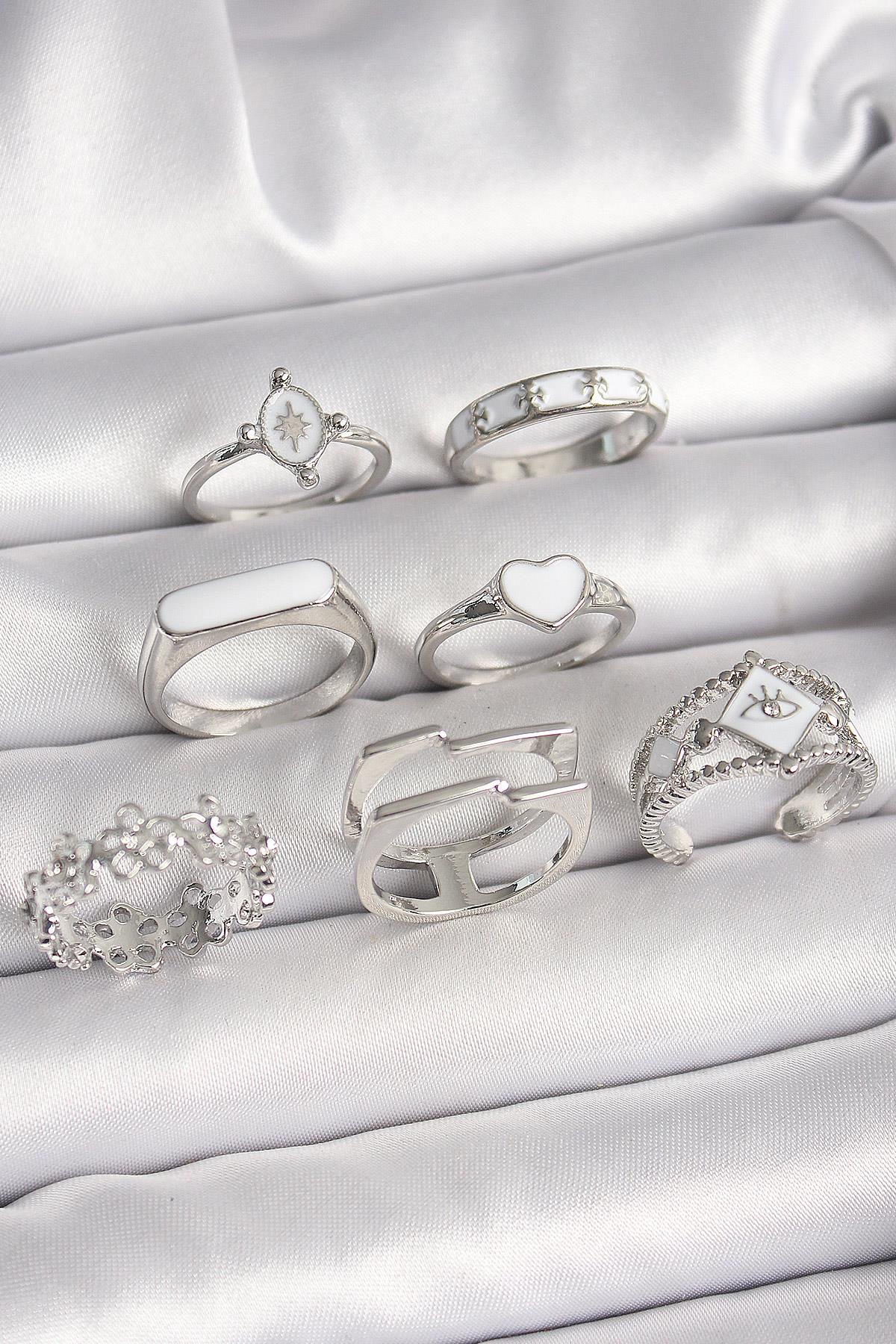 Pirinç Gümüş Renk Beyaz Mineli Kalp Çiçek Detay Kadın Yüzük Kombin