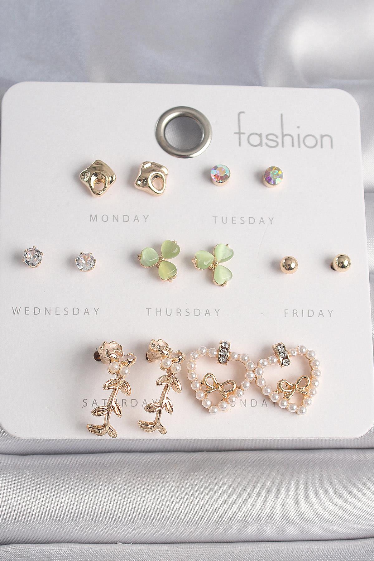 Pirinç Gümüş Renk İncili Kalp Figür Kurdela Detay 7 Çift Kadın Küpe Seti