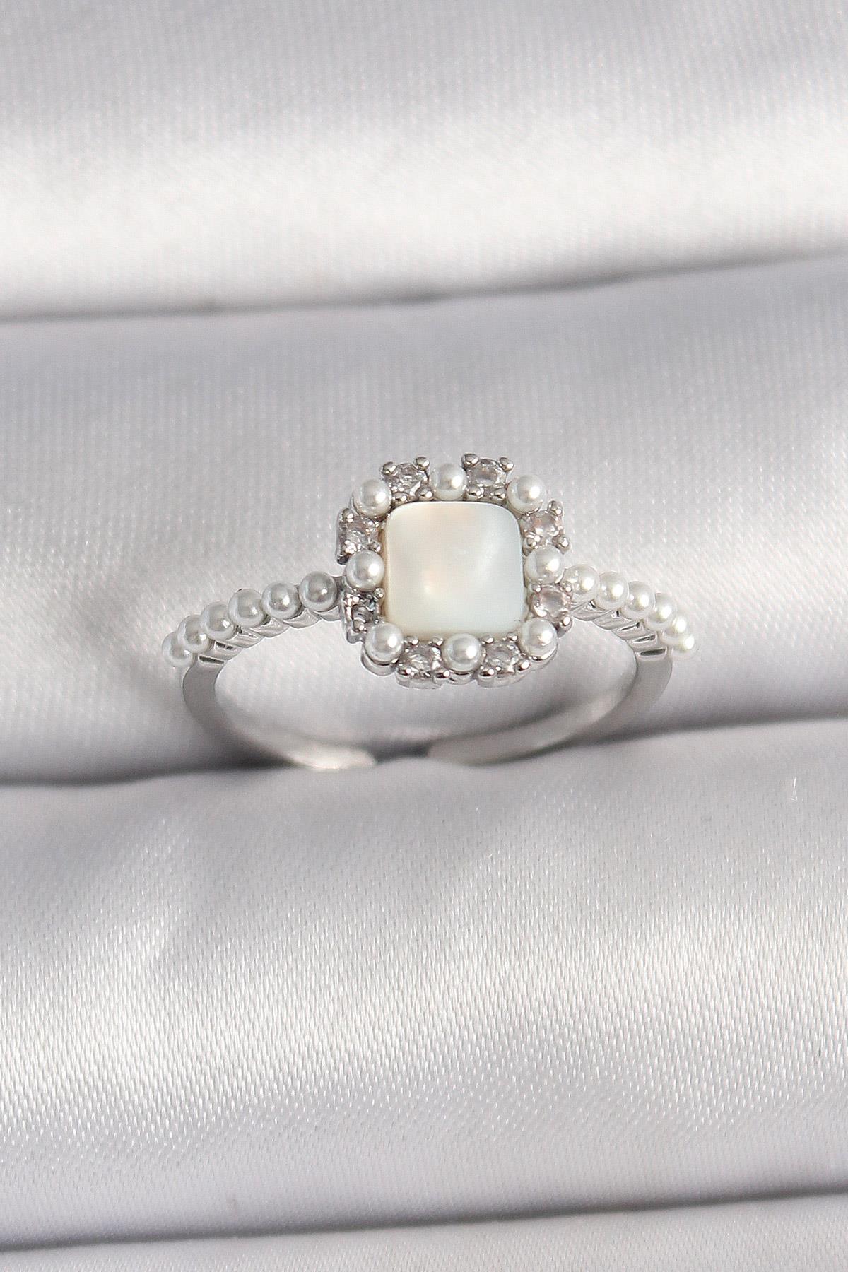 Pirinç Gümüş Renk İncili Kare Beyaz Mineli Ayarlanabilir Kadın Yüzük