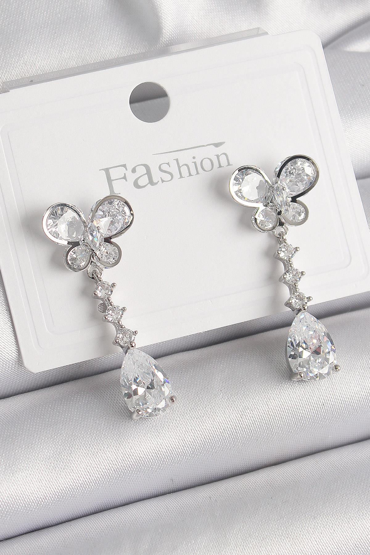 Pirinç Gümüş Renk Kelebek Model Sallantı Damla Zirkon Taşlı Kadın Küpe