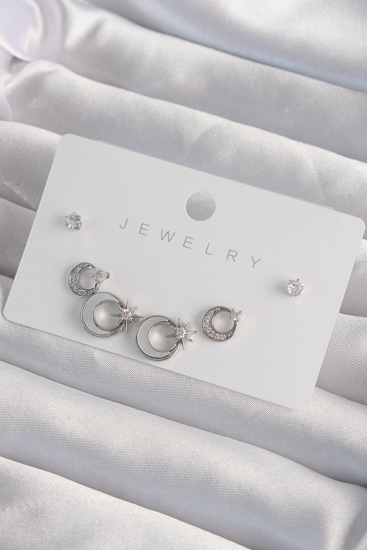 Pirinç Gümüş Renk Mineli Zirkon Taşlı Ay Yıldız Model Küpe Seti