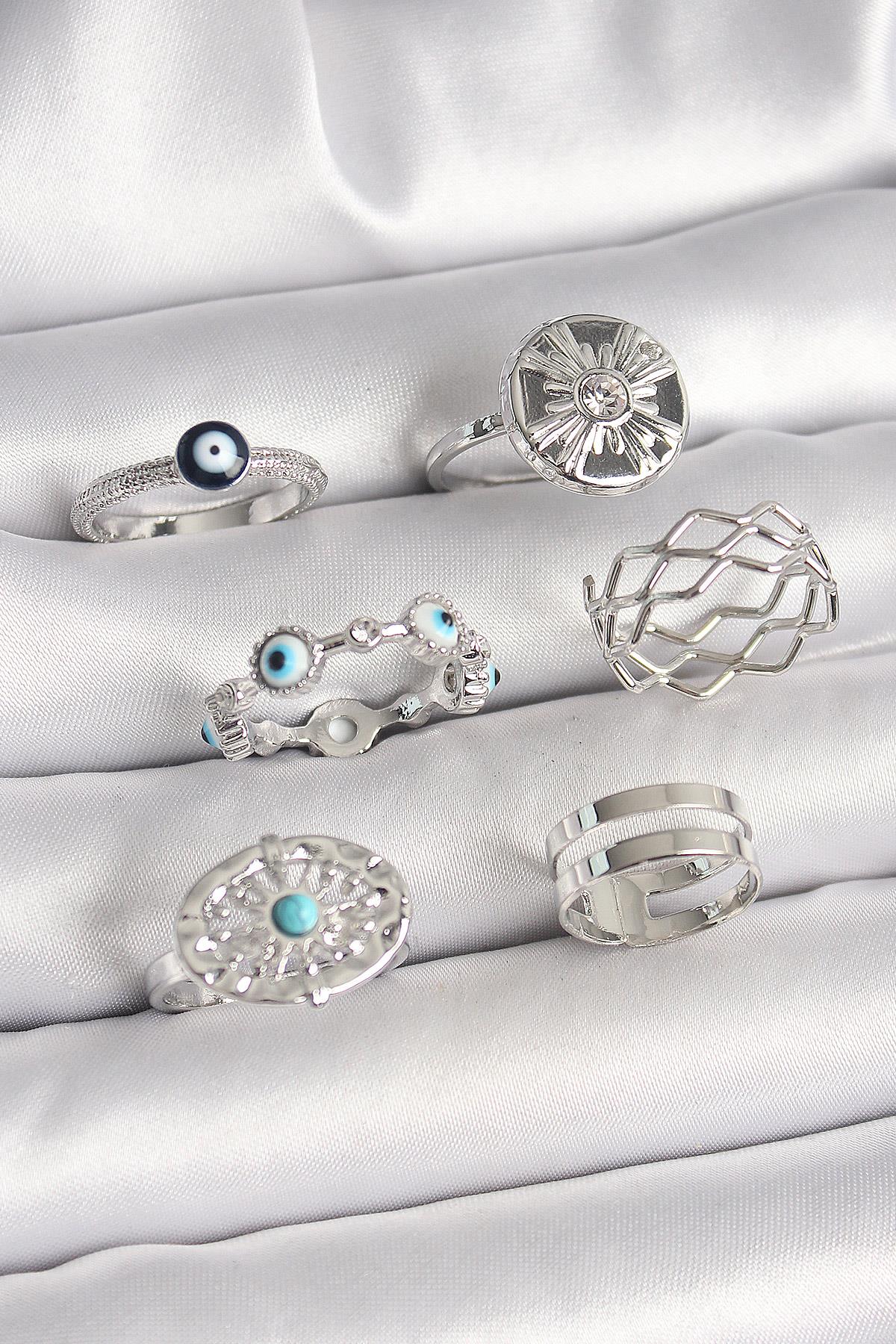 Pirinç Gümüş Renk Nazar Boncuk Zirkon Taş Detaylı Dalga Figür Kadın Yüzük Kombini