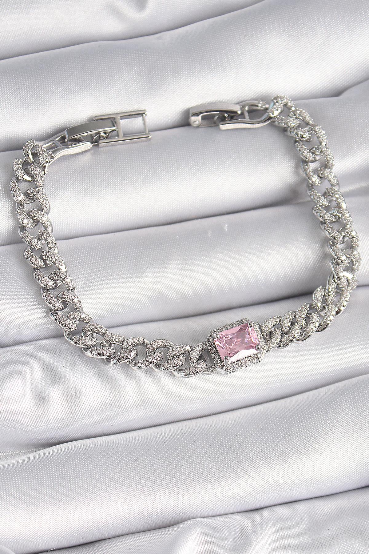 Pirinç Gümüş Renk Pembe Kare Zirkon Taşlı VIP Seri Kadın Bileklik