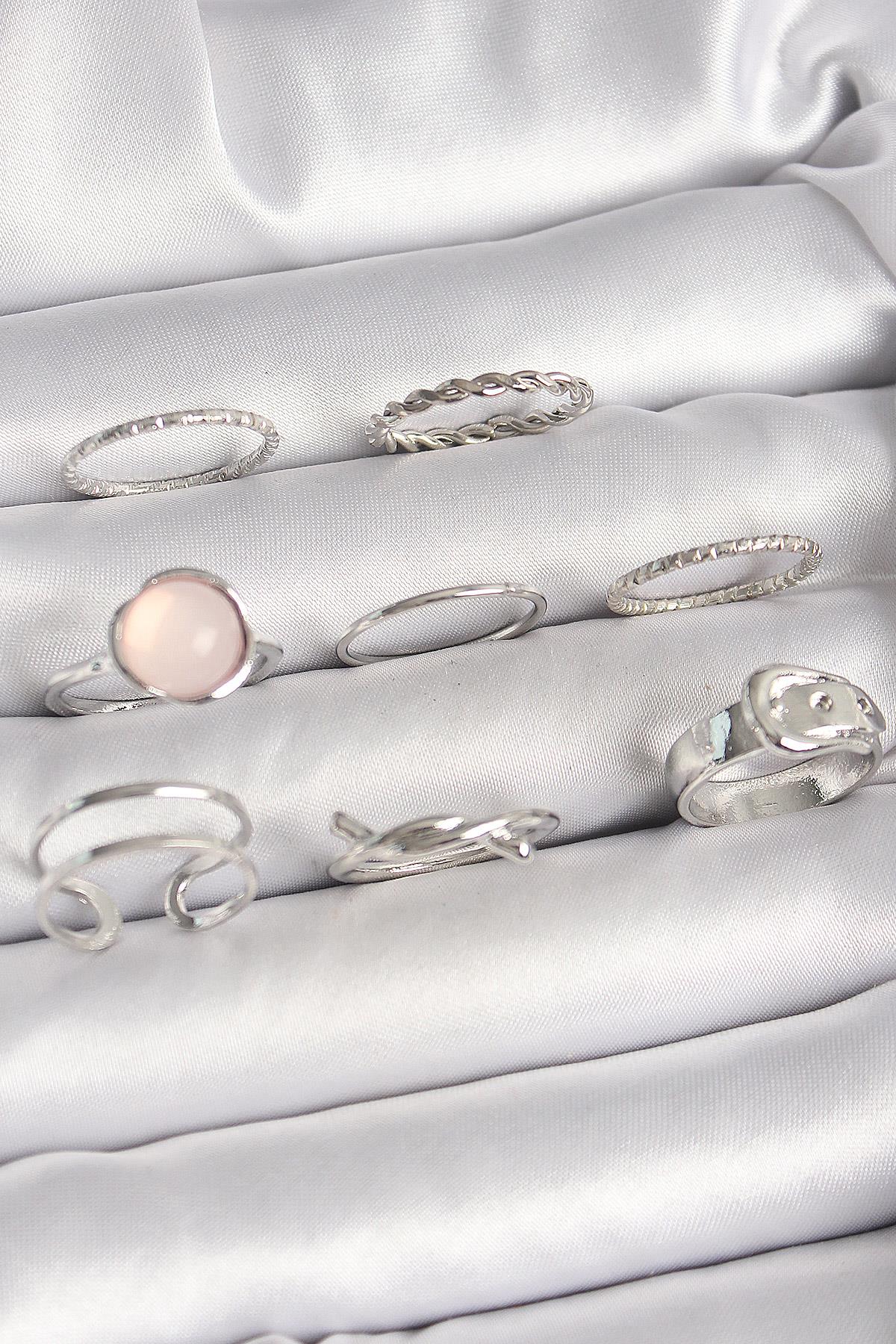 Pirinç Gümüş Renk Pembe Mineli Kemer Düğüm Figür Kadın Yüzük Kombini