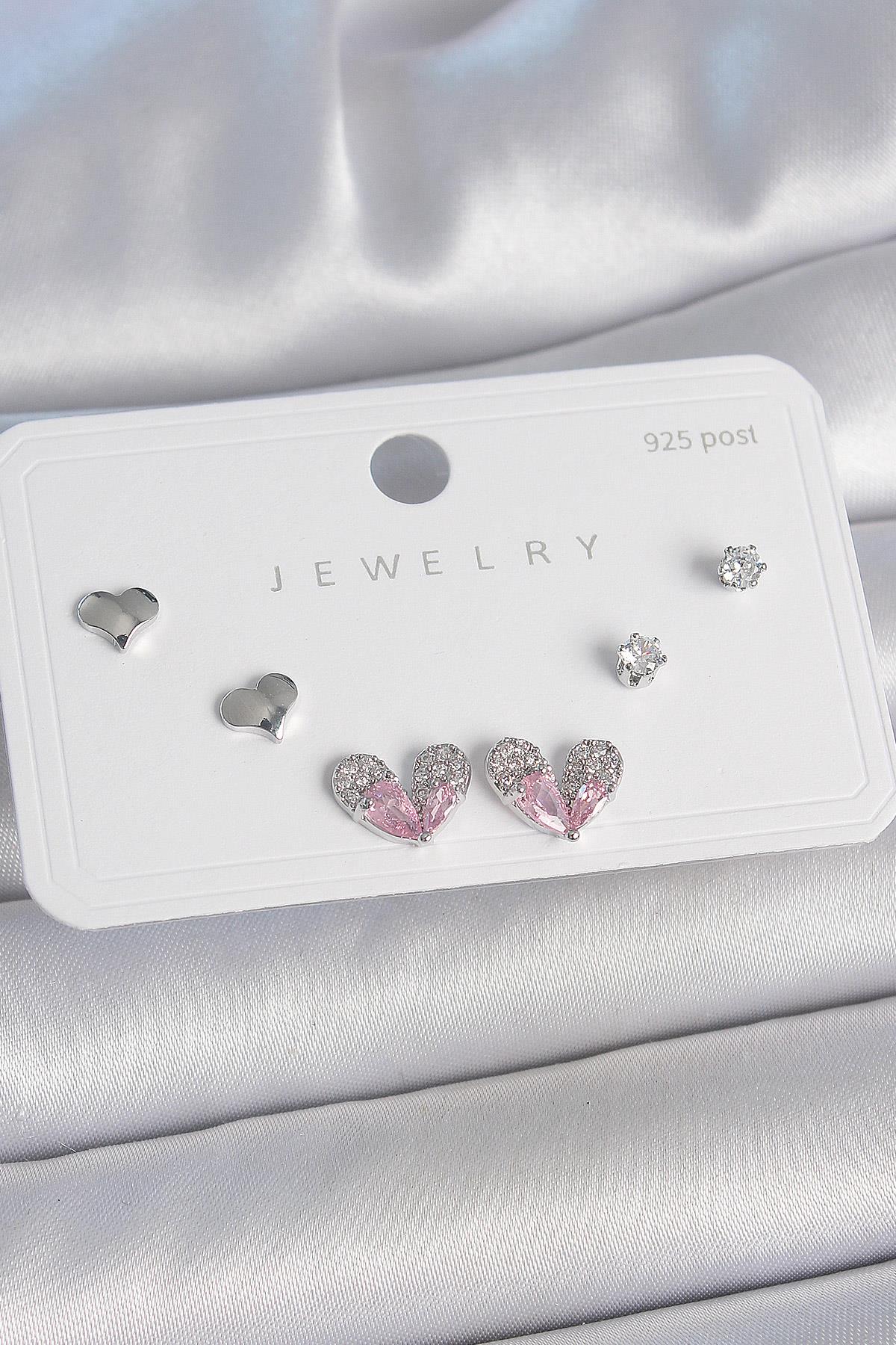 Pirinç Gümüş Renk Pembe Zirkon Taşlı Kalp Model 925 Ayar Gümüş Çivi Kadın Küpe Seti