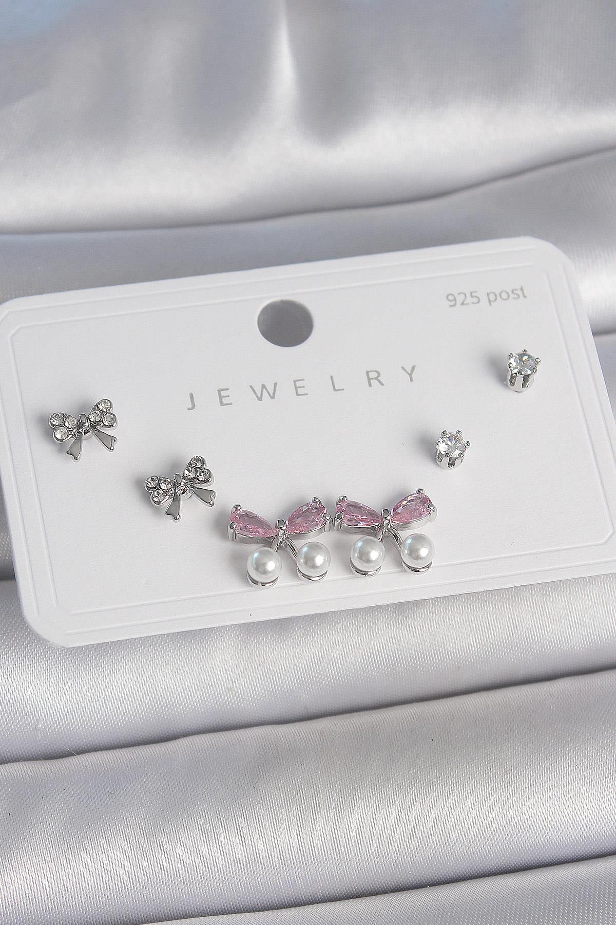 Pirinç Gümüş Renk Pembe Zirkon Taşlı Kurdele Model İnci Detay 925 Ayar Gümüş Çivi Kadın Küpe Seti