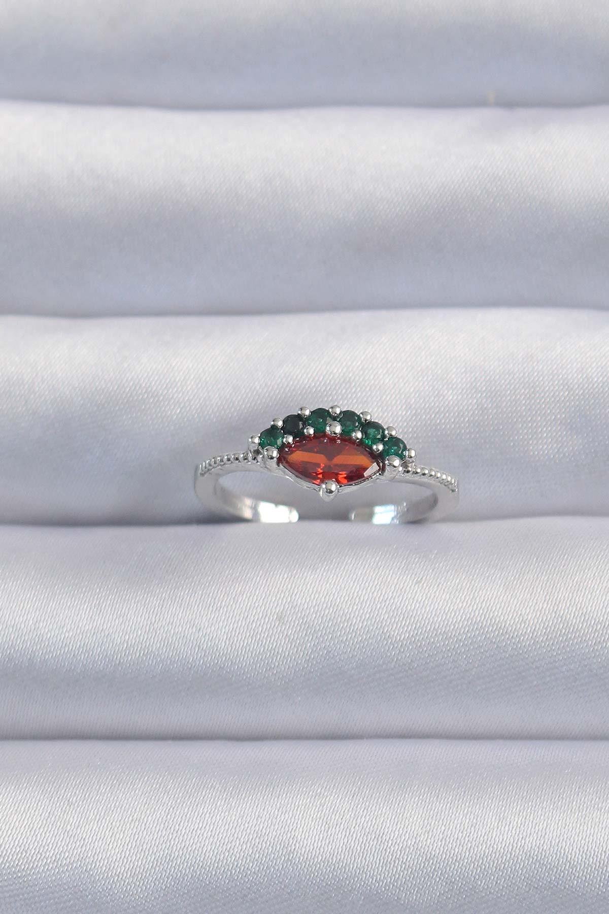 Pirinç Gümüş Renk Renkli Zirkon Taşlı Ayarlanabilir Karpuz Model Yüzük