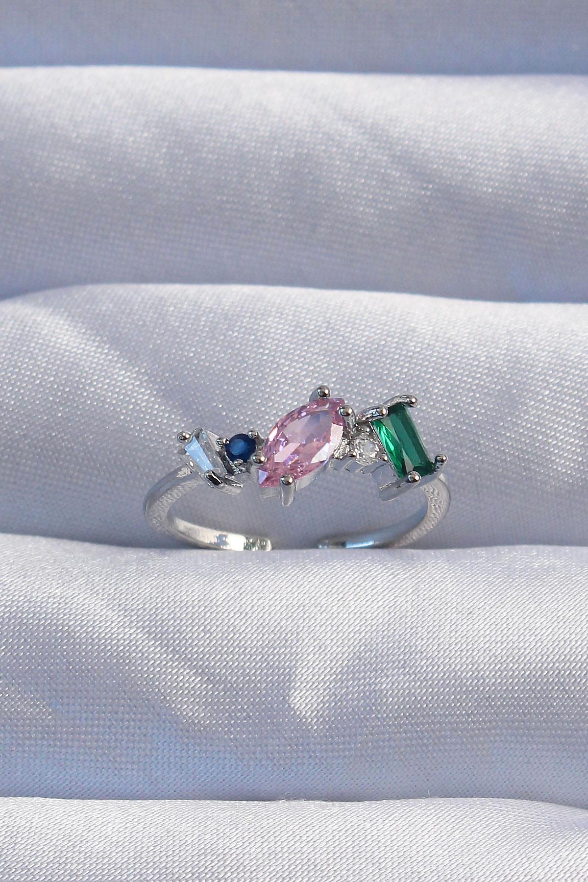 Pirinç Gümüş Renk Renkli Zirkon Taşlı Ayarlanabilir Yüzük