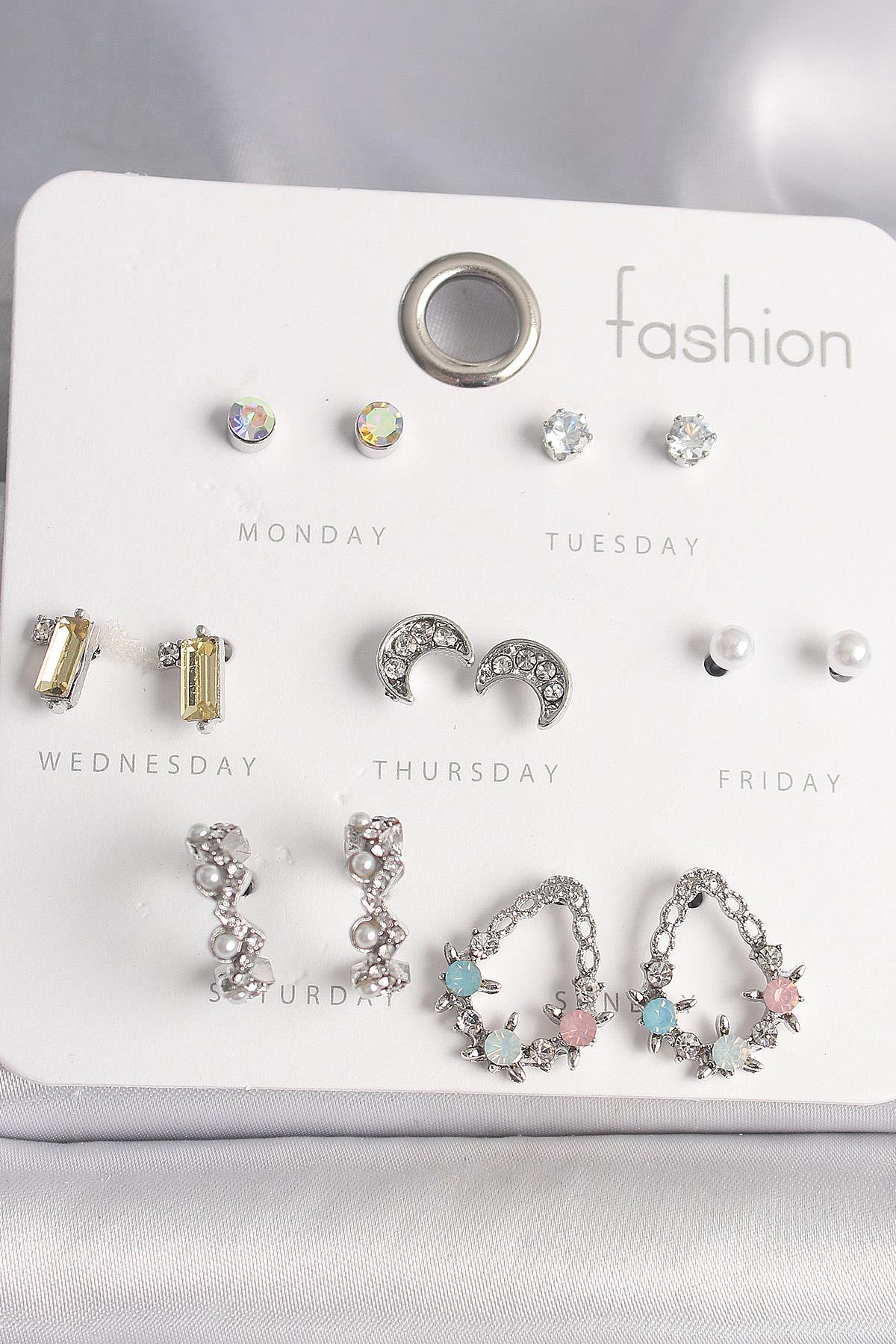 Pirinç Gümüş Renk Renkli Zirkon Taşlı Halka Damla Figür Hilal Detay 7 Çift Kadın Küpe Seti