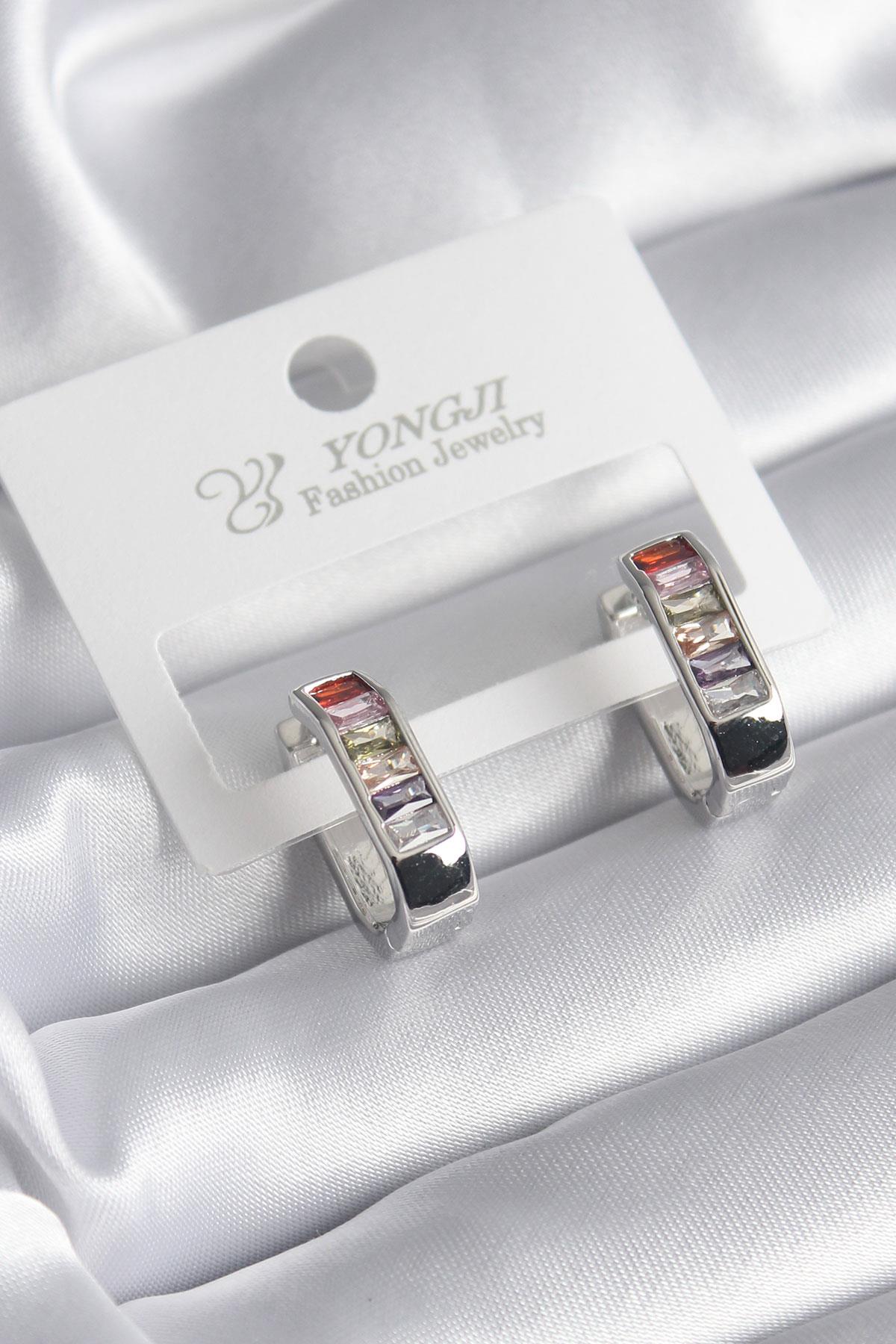 Pirinç Gümüş Renk Renkli Zirkon Taşlı Kadın Küpe