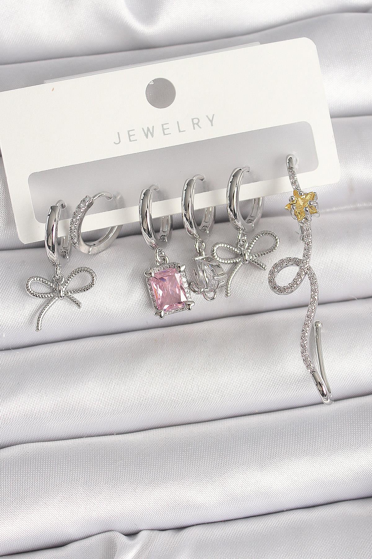 Pirinç Gümüş Renk Sallantı Kurdele Kuyruklu Yıldız Figür Pembe Kare Zirkon Taş Detay Kadın Küpe Seti
