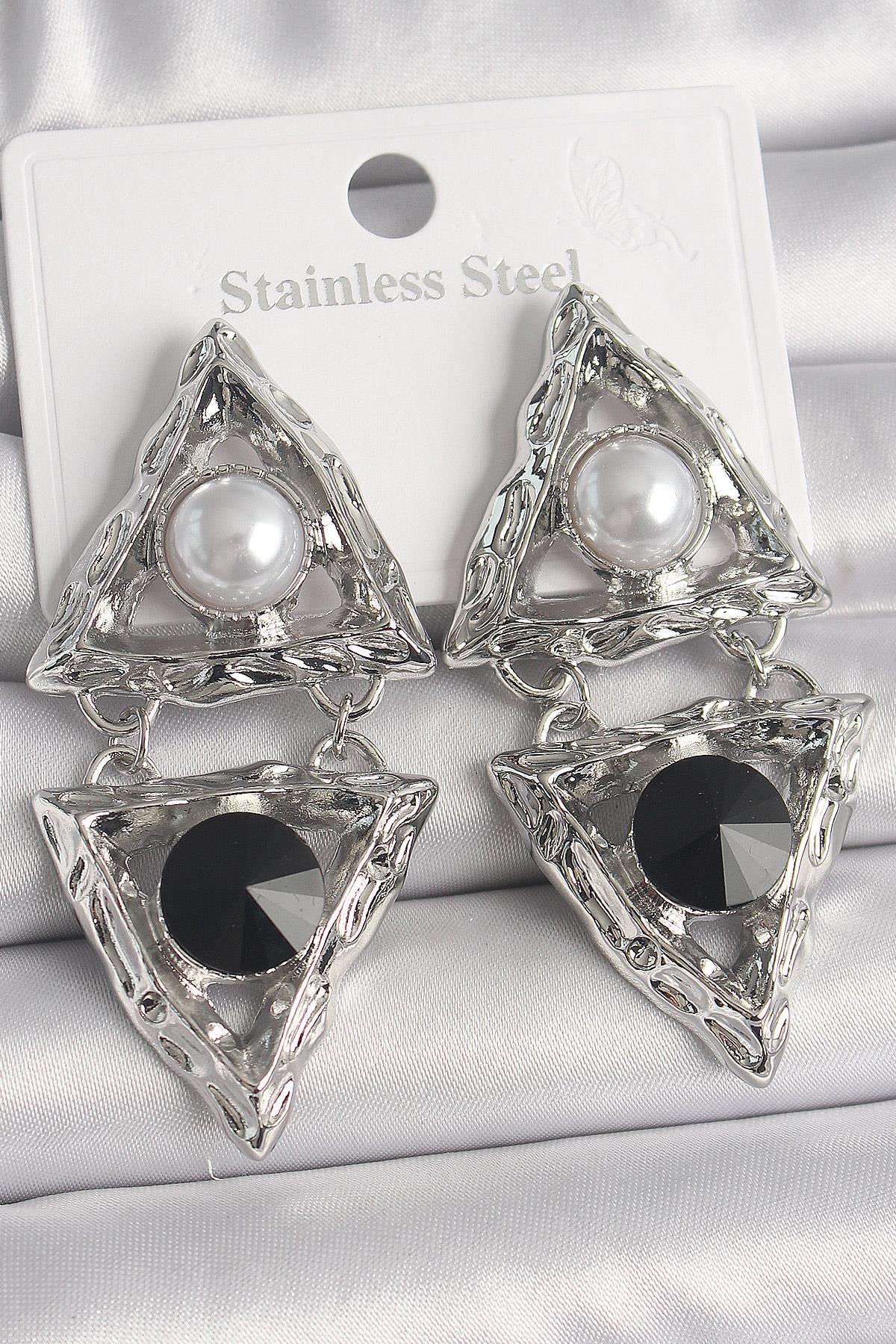 Pirinç Gümüş Renk Sallantı Üçgen Model İnci Detay Kadın Küpe