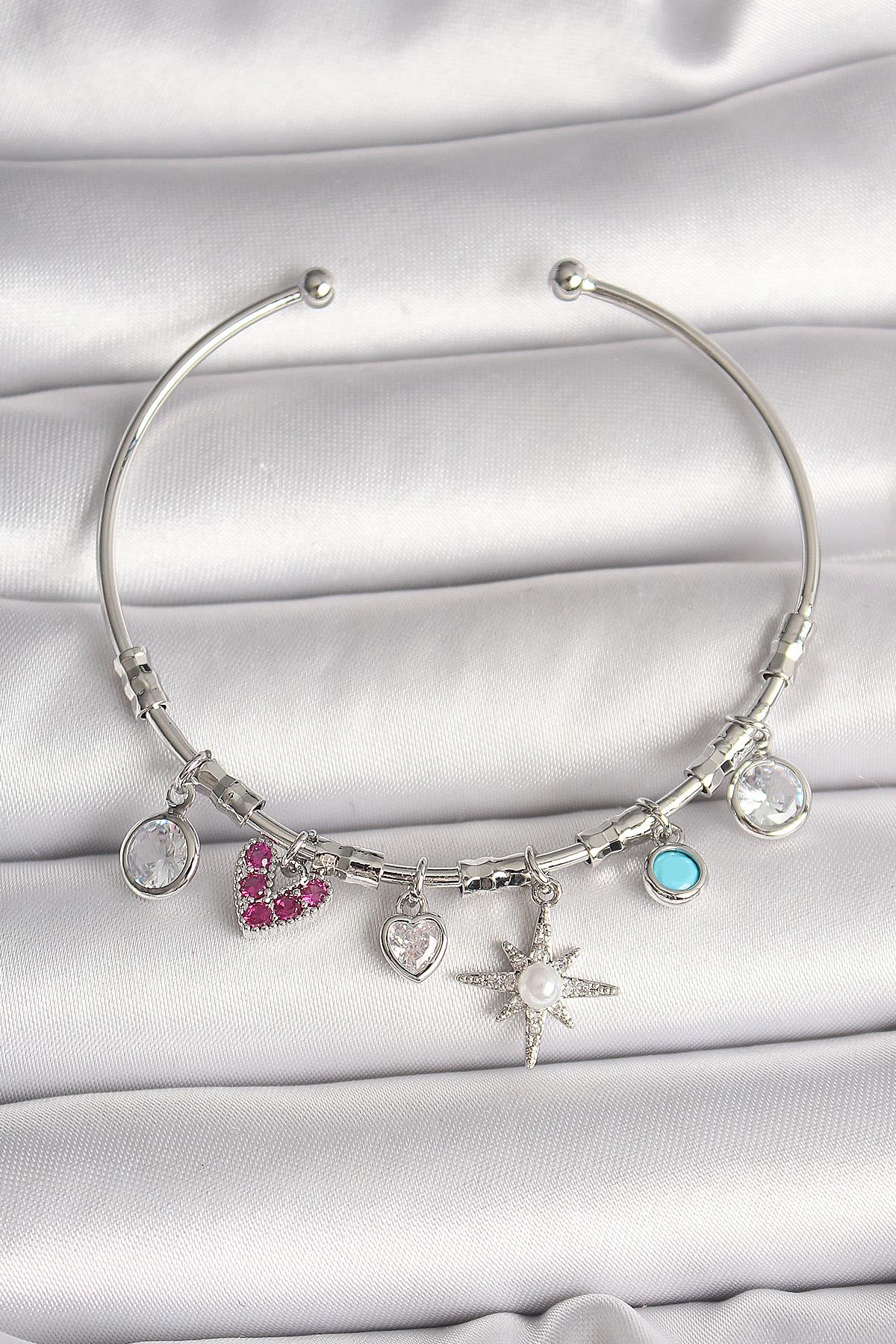 Pirinç Gümüş Renk Sallantı Zirkon Taşlı Kutup Yıldız Figür Kalp Detay Charm Kadın Bileklik