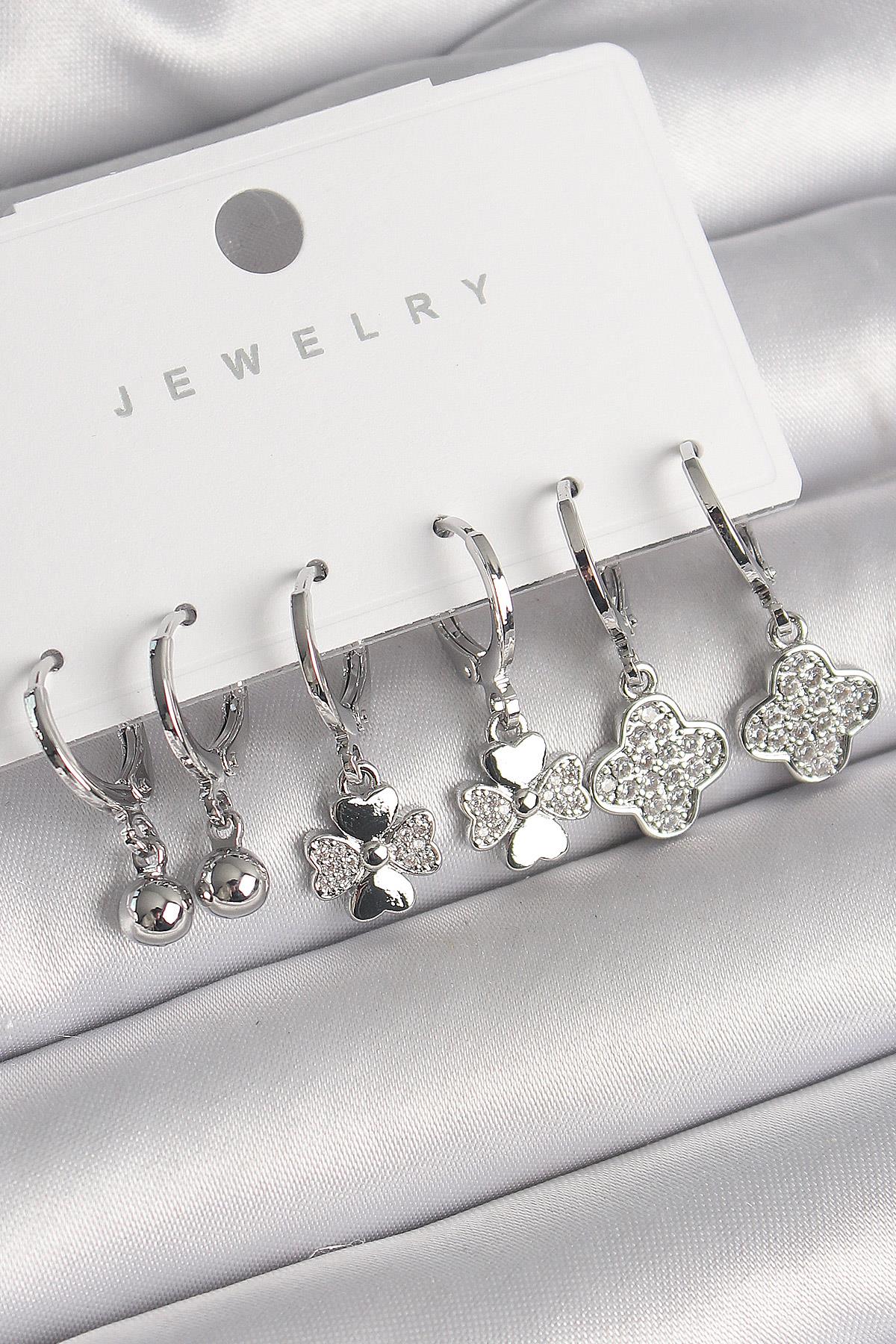 Pirinç Gümüş Renk Sallantı Zirkon Taşlı Yonca Model Topçuk Detay Kadın Küpe Seti