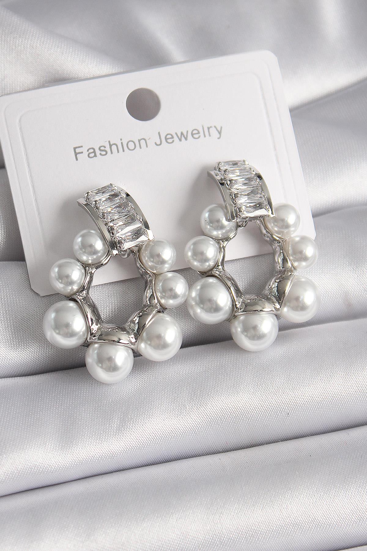Pirinç Gümüş Renk Su Yolu Zirkon Taşlı İncili Halka Model Kadın Küpe