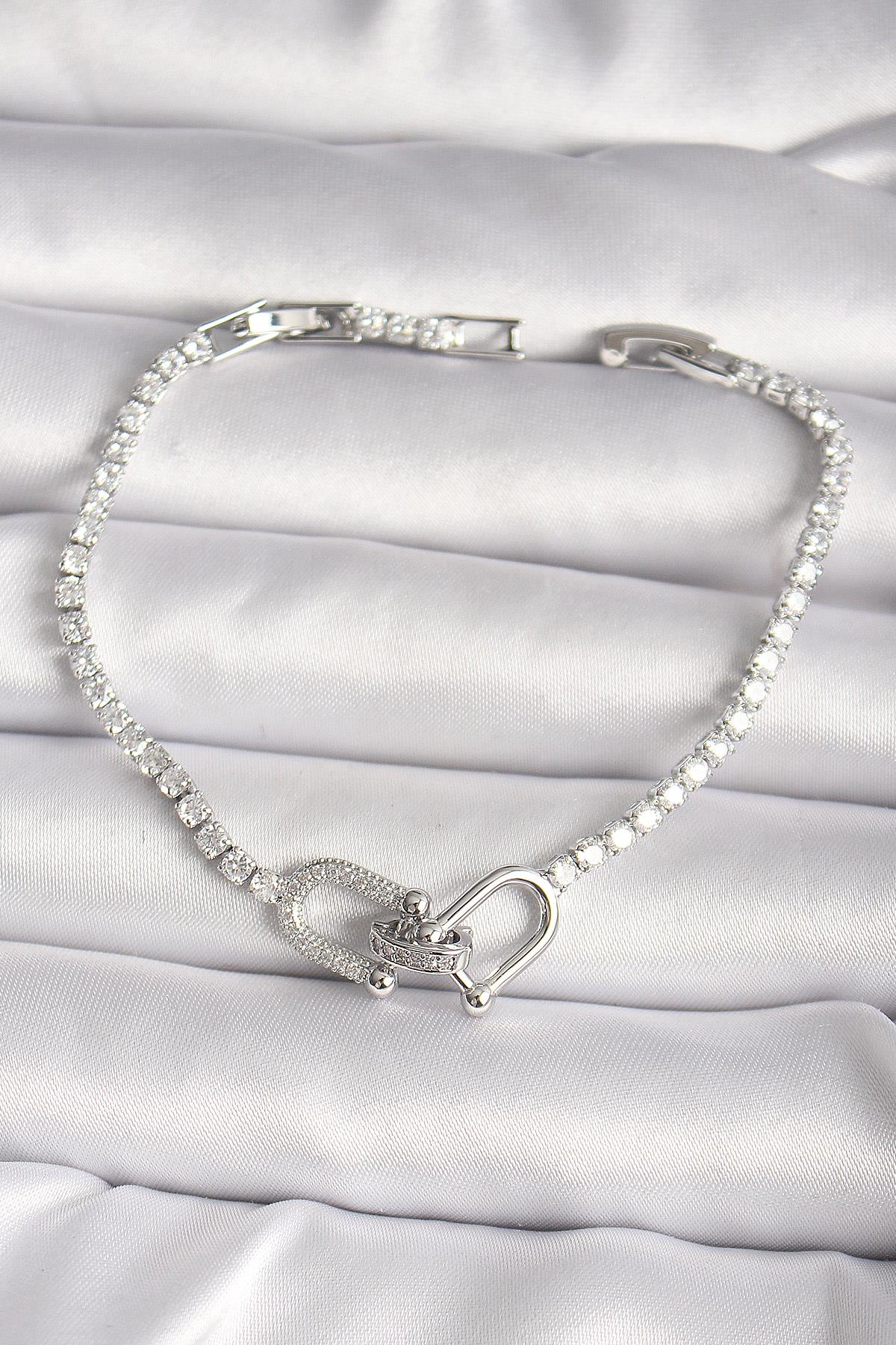 Pirinç Gümüş Renk Su Yolu Zirkon Taşlı Model Kadın Bileklik