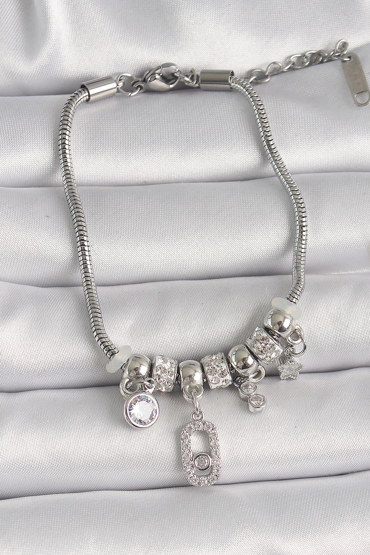 Pirinç Gümüş Renk Zincir Sallantı Zirkon Taşlı Messika Figür Yıldız Detay Kadın Bileklik