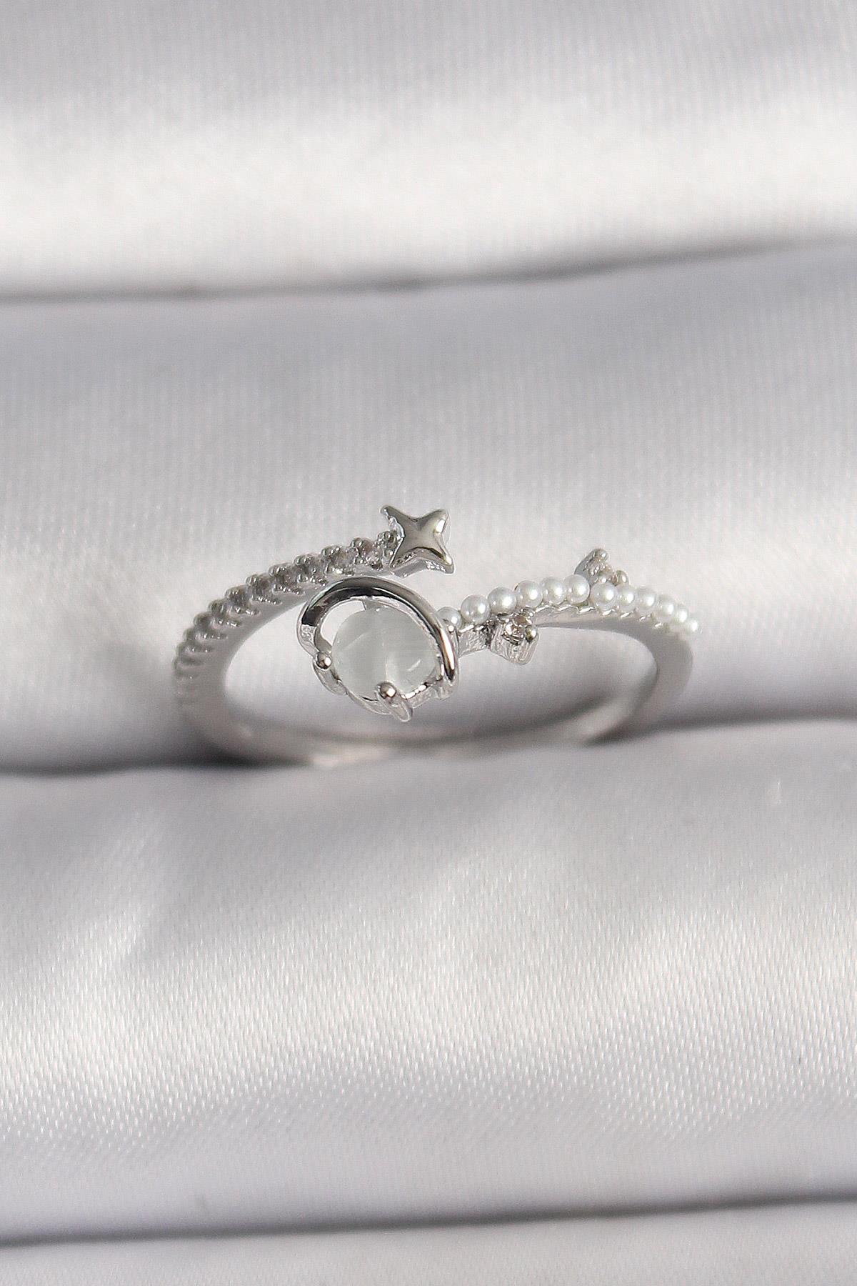 Pirinç Gümüş Renk Zirkon Taşlı Beyaz Mineli Yıldız Detay Ayarlanabilir Kadın Yüzük