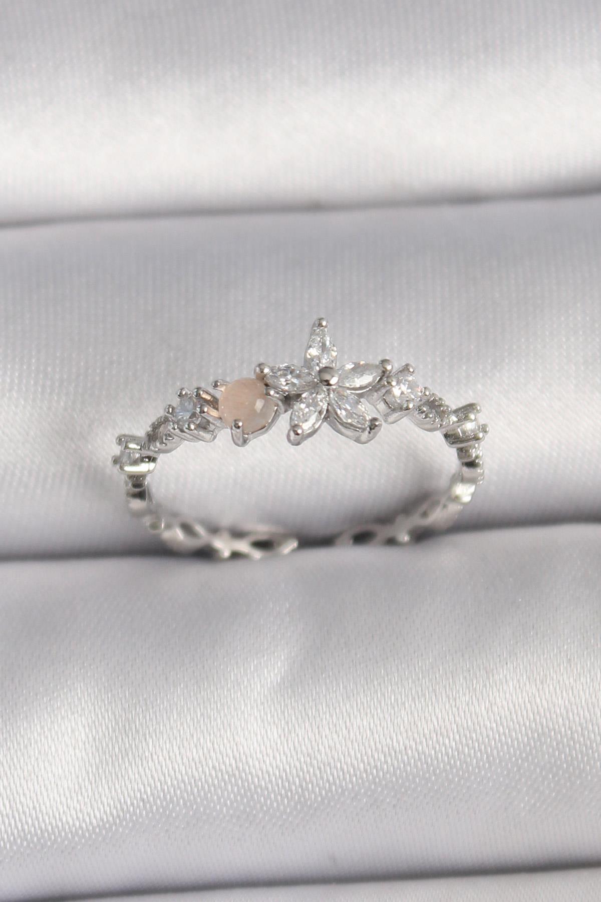 Pirinç Gümüş Renk Zirkon Taşlı Çiçek Model Ayarlanabilir Yüzük