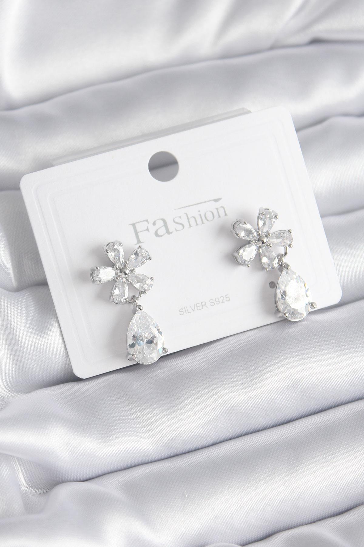 Pirinç Gümüş Renk Zirkon Taşlı Çiçek Model Damla Model Kadın Küpe