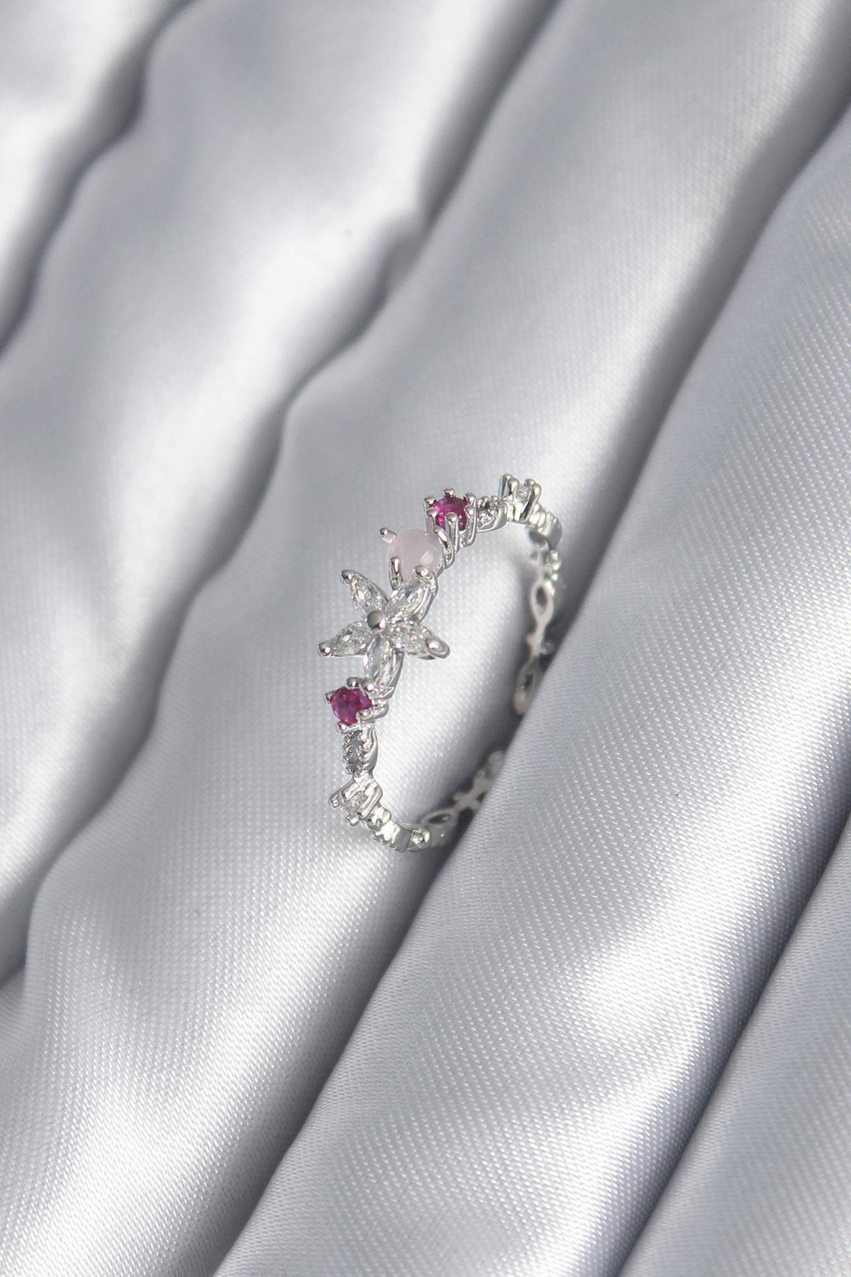 Pirinç Gümüş Renk Zirkon Taşlı Çiçek Model Pembe Zirkon Taş Detay Kadın Yüzük