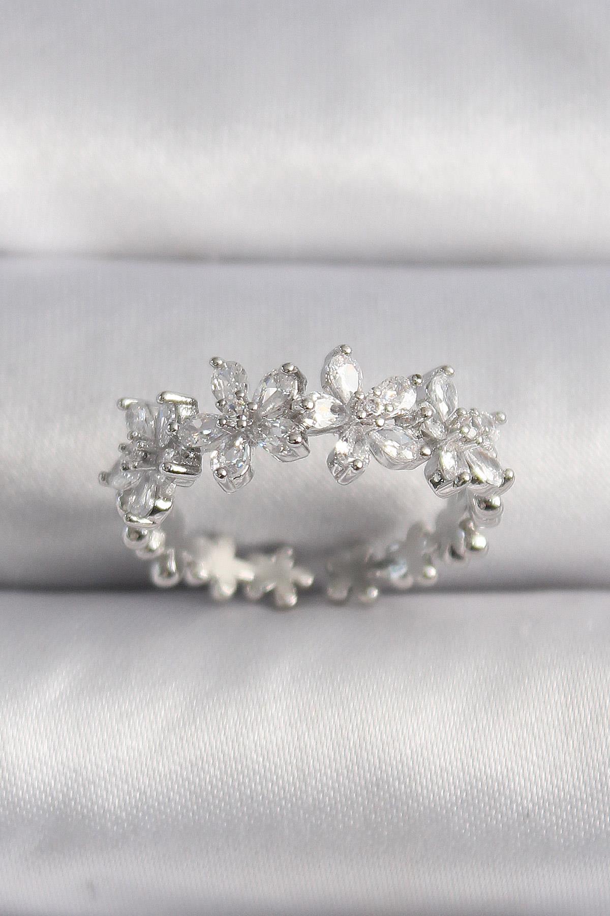 Pirinç Gümüş Renk Zirkon Taşlı Çiçek Model VIP Seri Kadın Yüzük