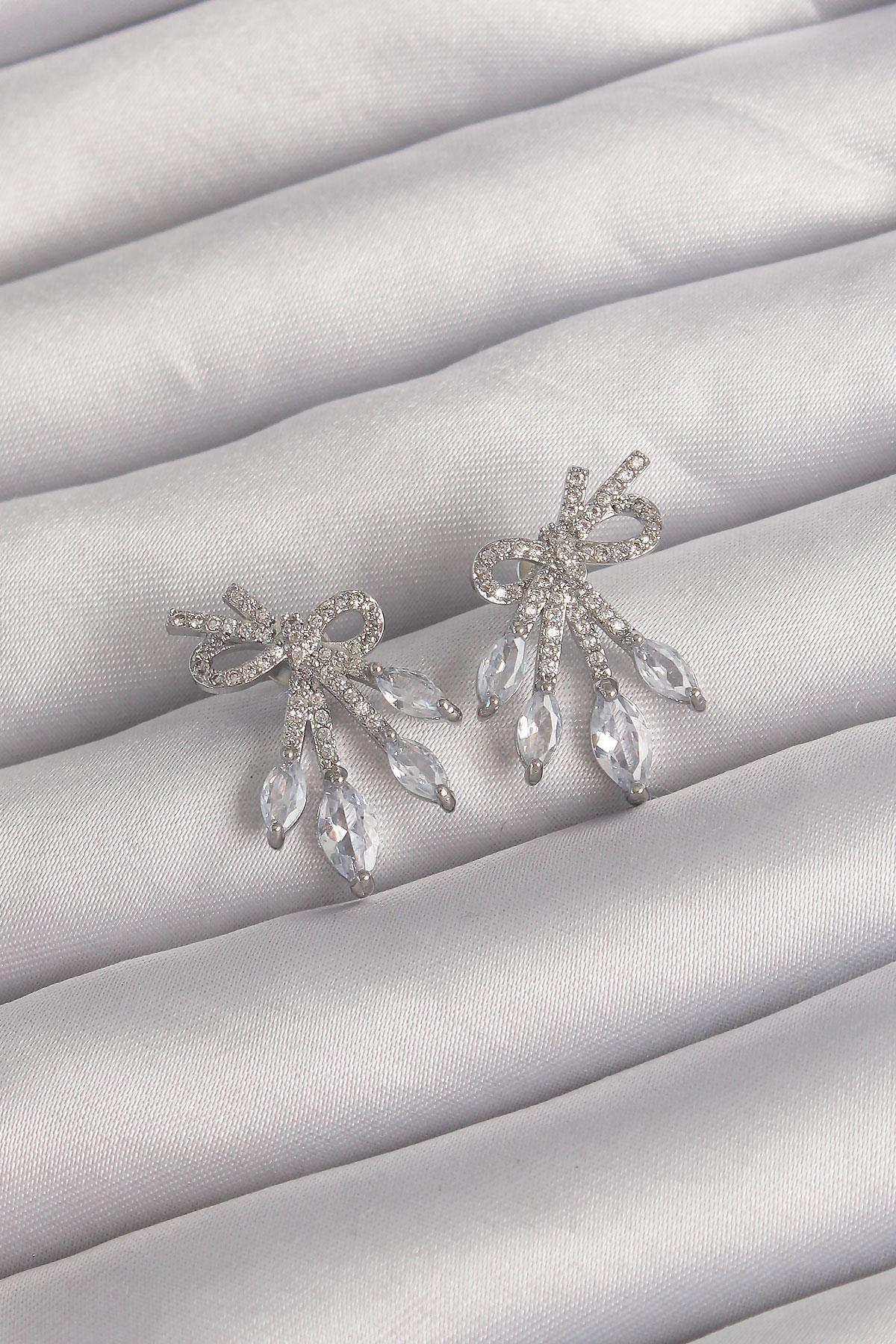 Pirinç Gümüş Renk Zirkon Taşlı Fiyonk Küpe