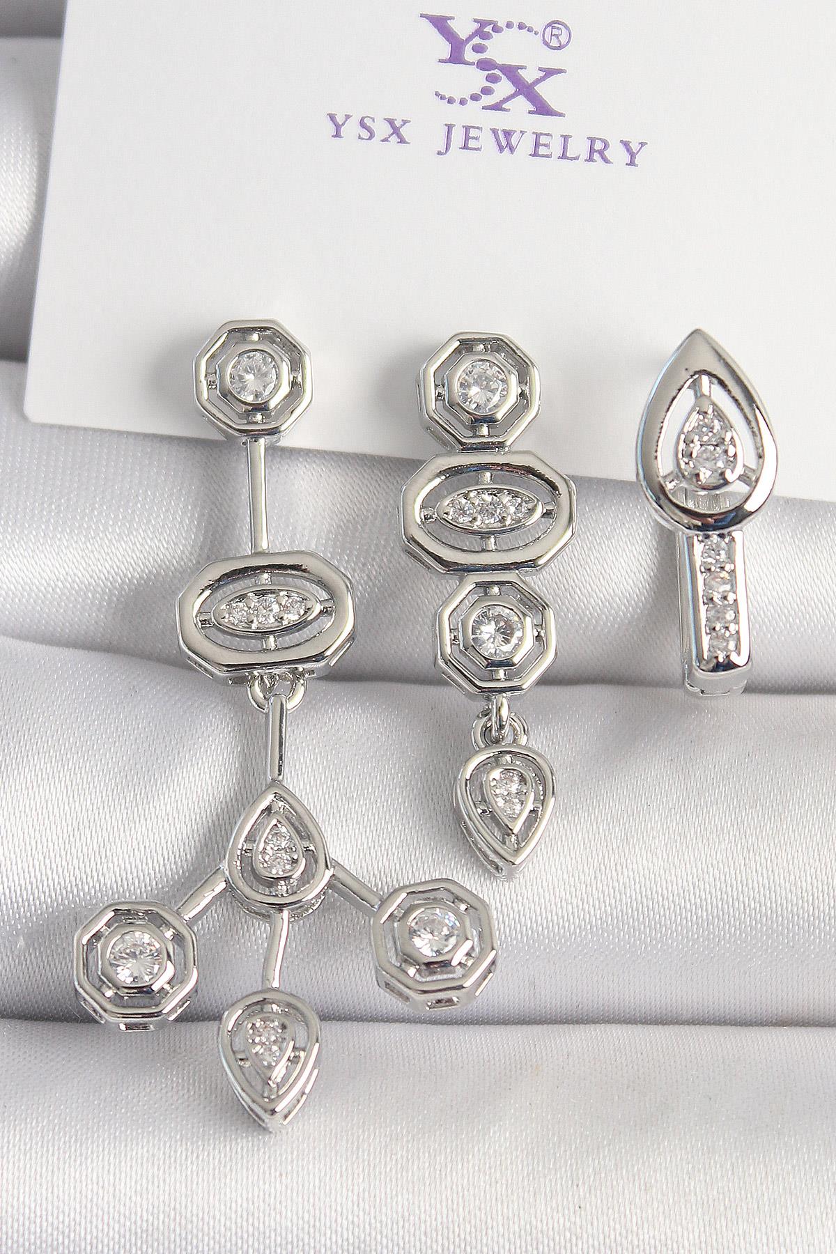 Pirinç Gümüş Renk Zirkon Taşlı Geometrik Model 3'Lü Kadın Kombin Küpe