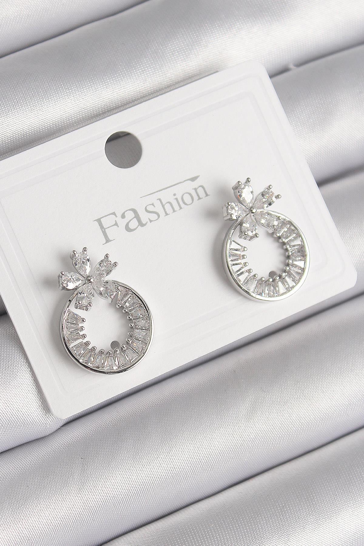 Pirinç Gümüş Renk Zirkon Taşlı Halka Model Çiçek Figür Kadın Küpe