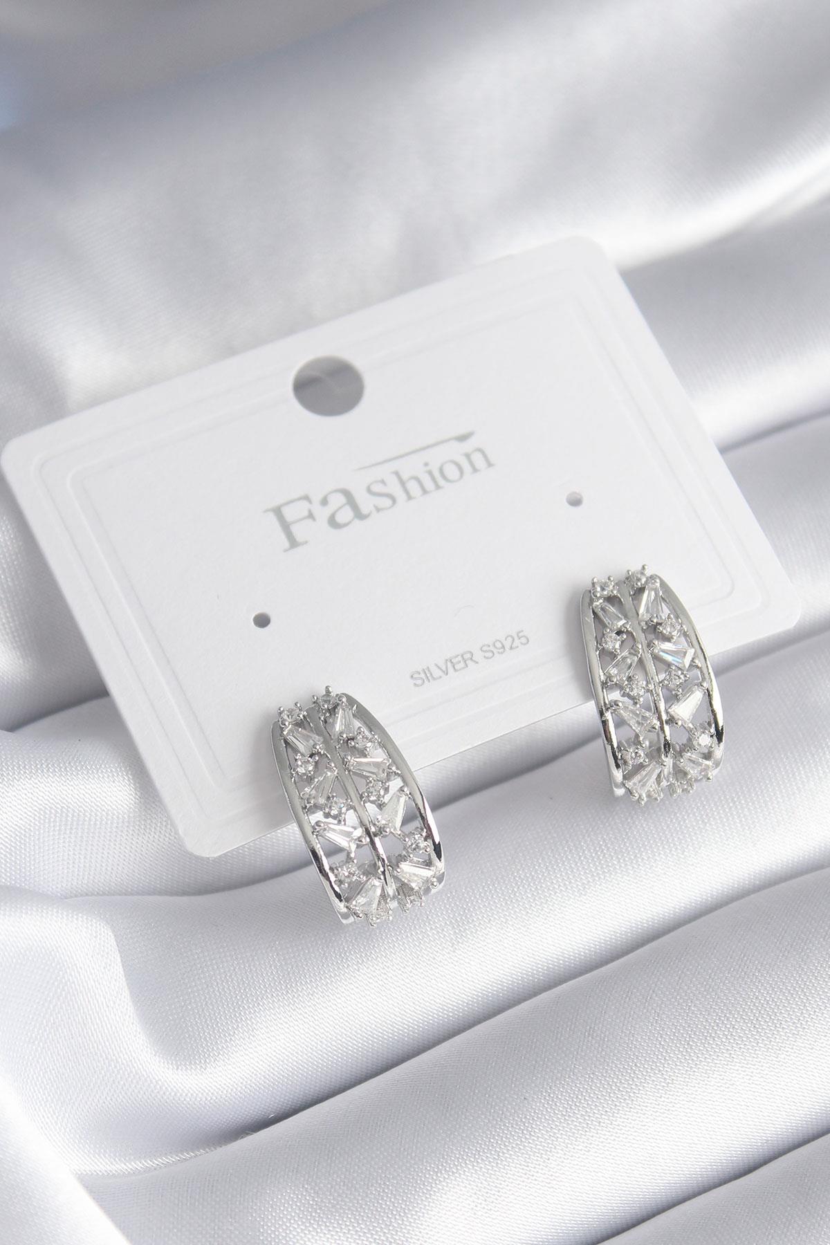 Pirinç Gümüş Renk Zirkon Taşlı Kadın Küpe