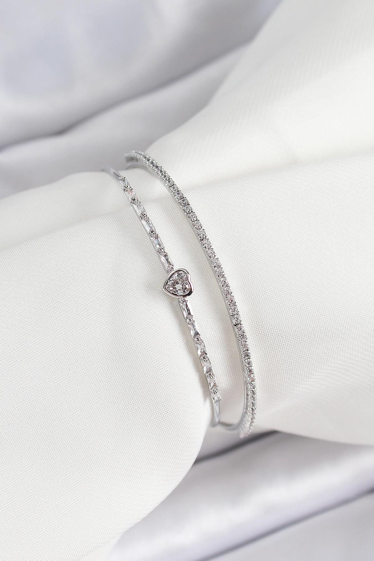Pirinç Gümüş Renk Zirkon Taşlı Kalp Detaylı Kadın Bileklik