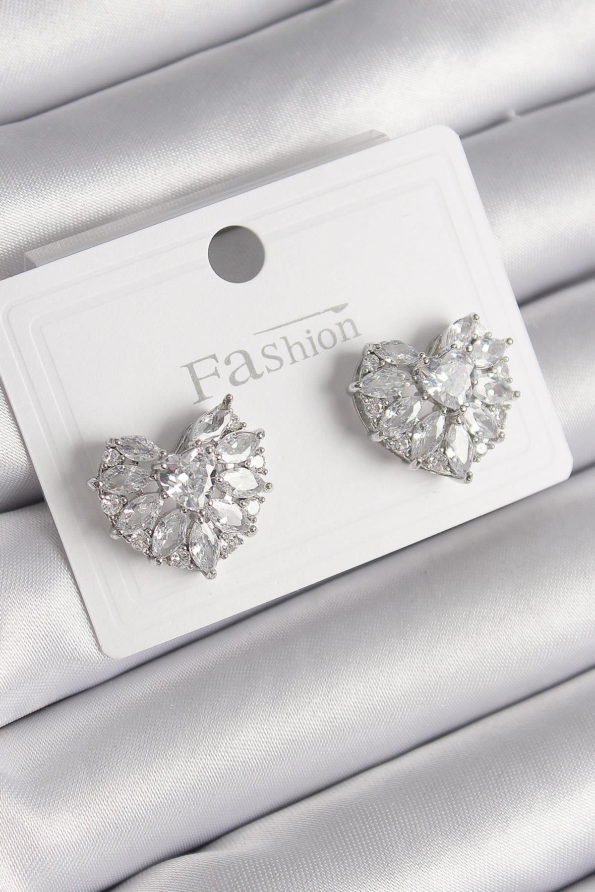 Pirinç Gümüş Renk Zirkon Taşlı Kalp Model Kadın Küpe