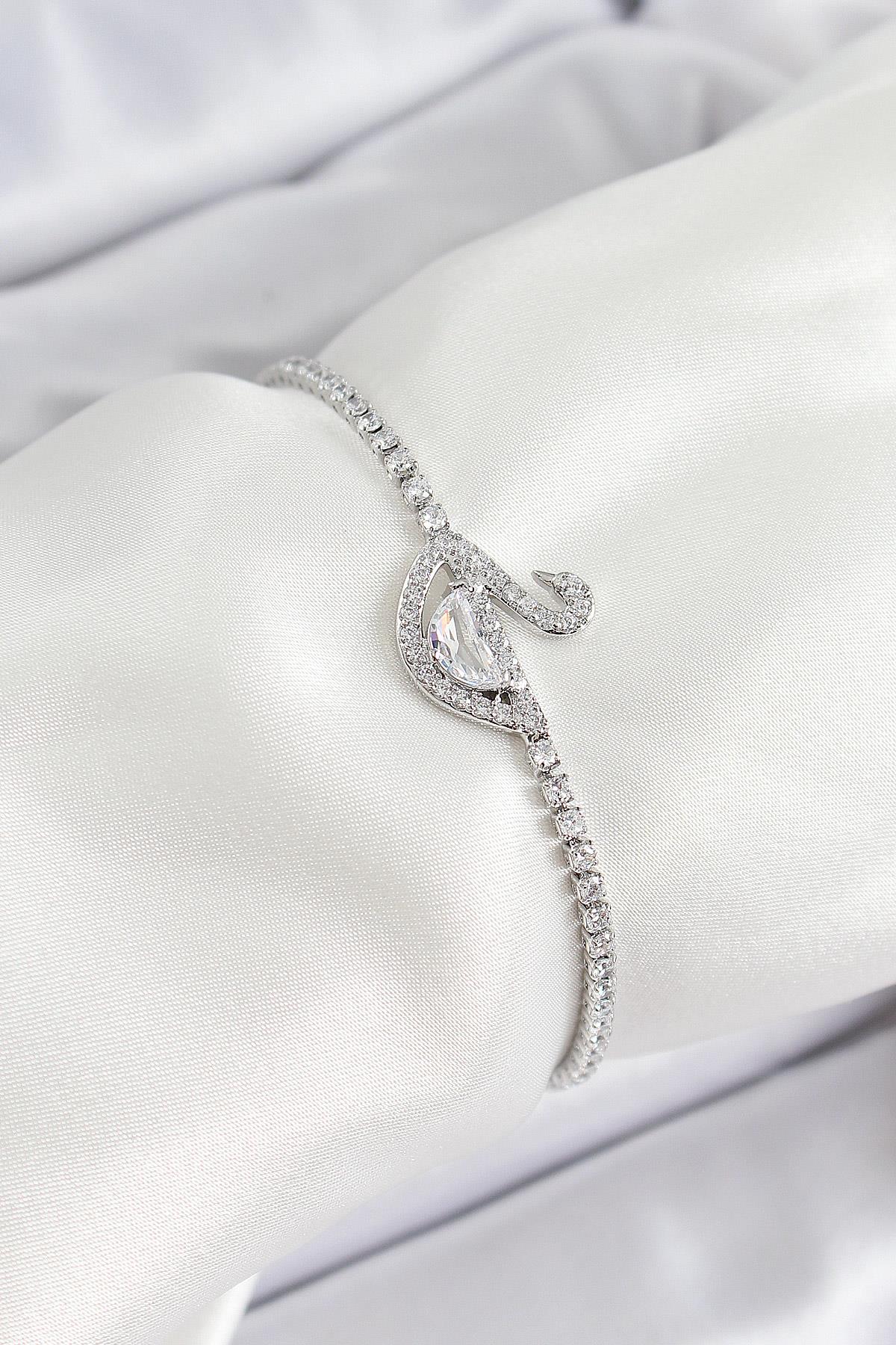 Pirinç Gümüş Renk Zirkon Taşlı Kuğu Model Kadın Bileklik